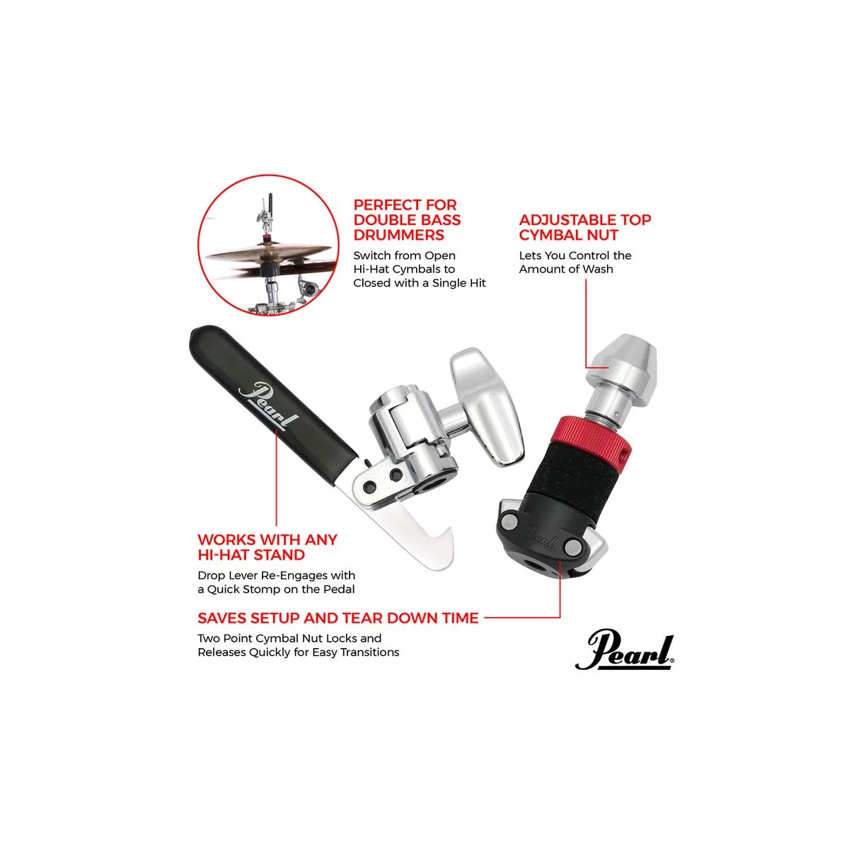 Благодаря запатентованной функции быстрого снятия нижней гайки, замок для хай-хета Pearl HCL-205DQR - это то, чего ждал каждый концертирующий барабанщик. Просто зажмите обе стороны и лекго снимите гайку для установки верхней тарелки хай-хета, также легко установите нижнюю гайку обратно и отрегулируйте степень зажима тарелки с помощью верхней гайки. Функция Drop clutch позволяет быстро опустить верхнюю тарелку хай-хета для игры в закрытом положении при использовании двух бас барабанов или двойной педали. Возврат тарелки в первоначальное положение происходит нажатием педали стойки хай-хета. Зажим Super Grip обхватывает стержень стойки хай-хета и надёжно фиксирует замок, исключая возможность проскальзывания, в отличие от стандартных зажимов.