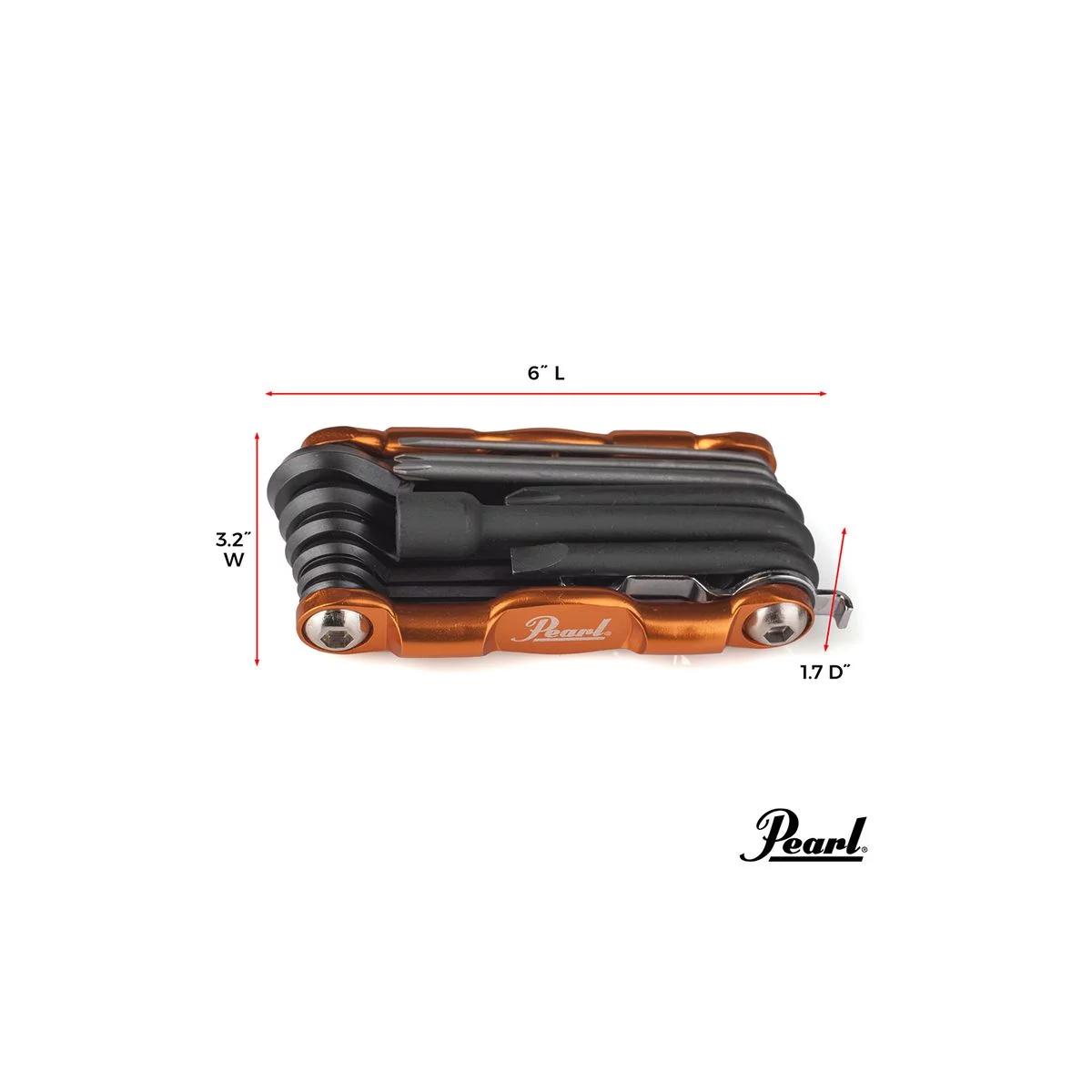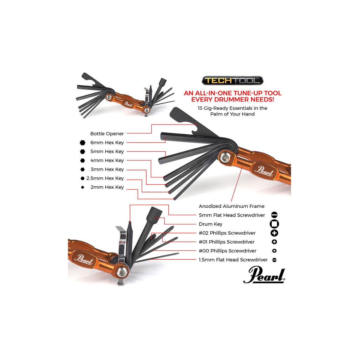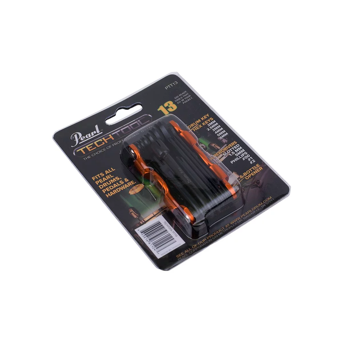 Мультитул Pearl PTT13 TechTool помимо стандартного барабанного ключа включает в себя 6 шестигранных ключей, 5 отверток и открывалку для бутылок. Каждый экземпляр выкован с точными допусками из термообработанного сплава S2 и имеет черное анодированное покрытие. Имея в общей сложности 13 инструментов, специально подобранных для любой серии барабанов, педалей и стоек Pearl, данный мультитул может быть использован везде: на концертах, в студии, на репетеционной точке.