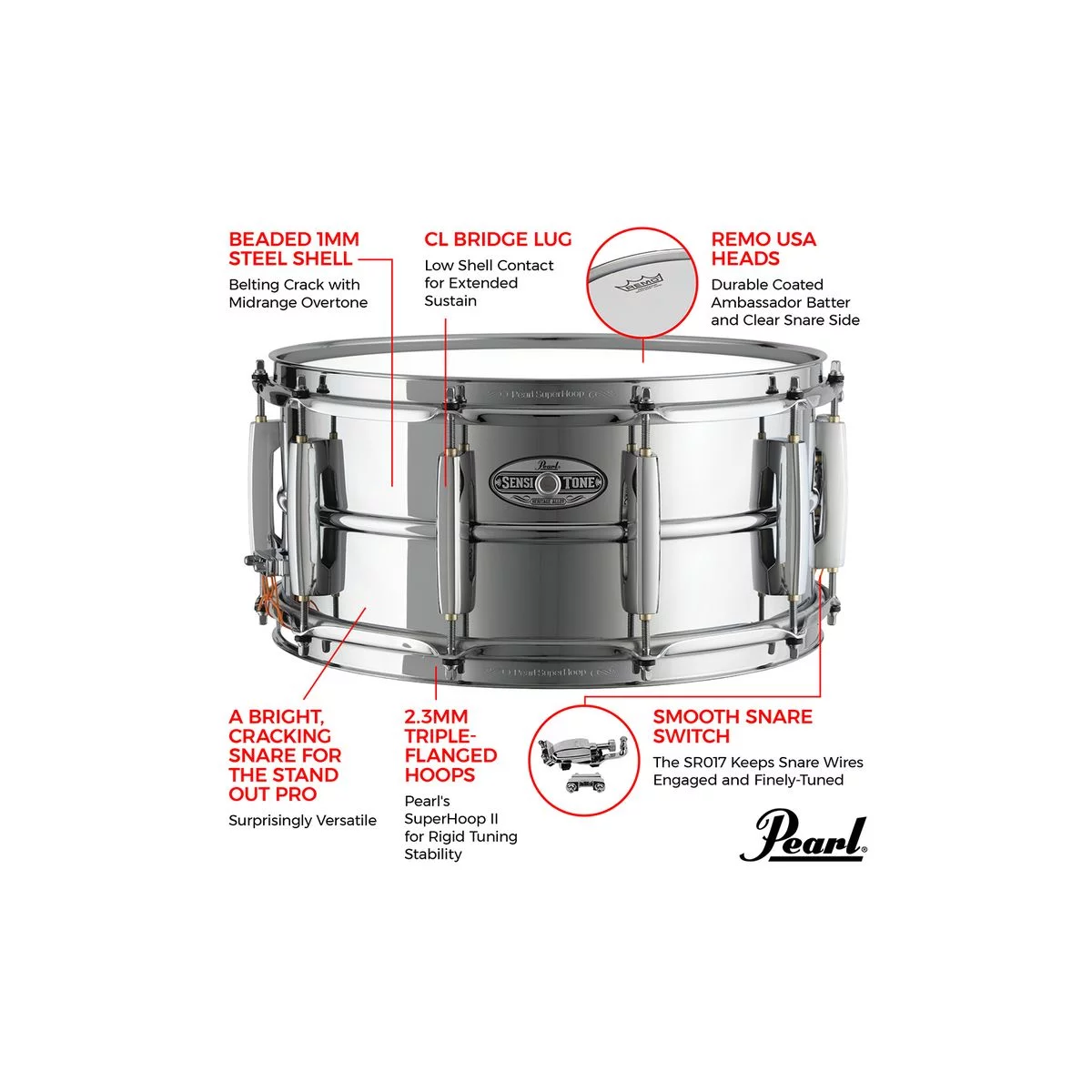 Основанные на позиционировании малых барабанов Pearl SensiTone как инструментов с хорошим соотношением цена/качество для профессионального барабанщика, барабаны с хромированным стальным корпусом с жёлобом Heritage Alloy Steel толщиной 1 мм обеспечивают высокочувствительный щелчок, напоминающий звучание победителей чартов вчерашних дней. Они обладают всем необходимым для выступления, что делает их стандартом для мощных барабанщиков. Они тонально универсальны, с потрескивающей проекцией и гладкими обертонами.