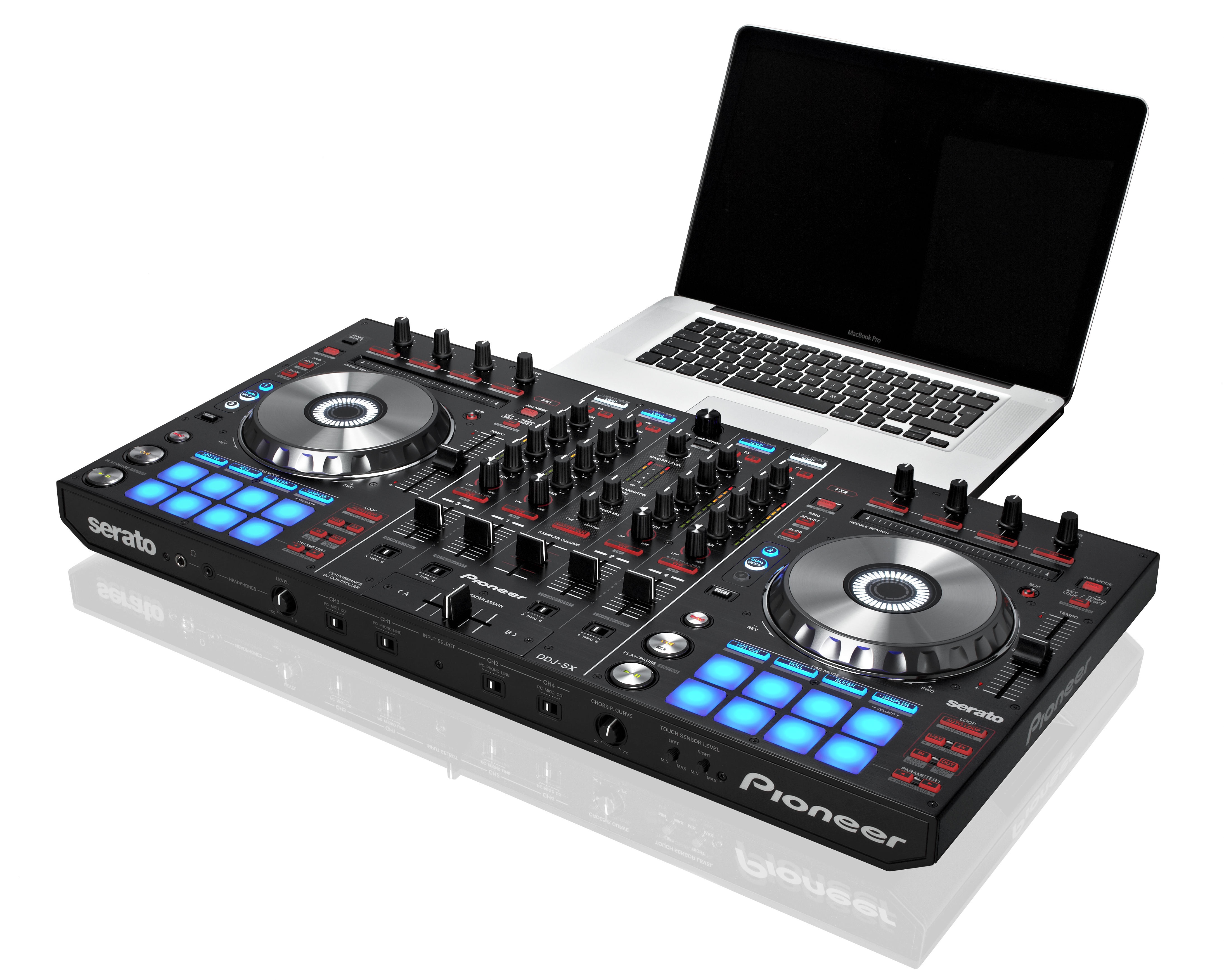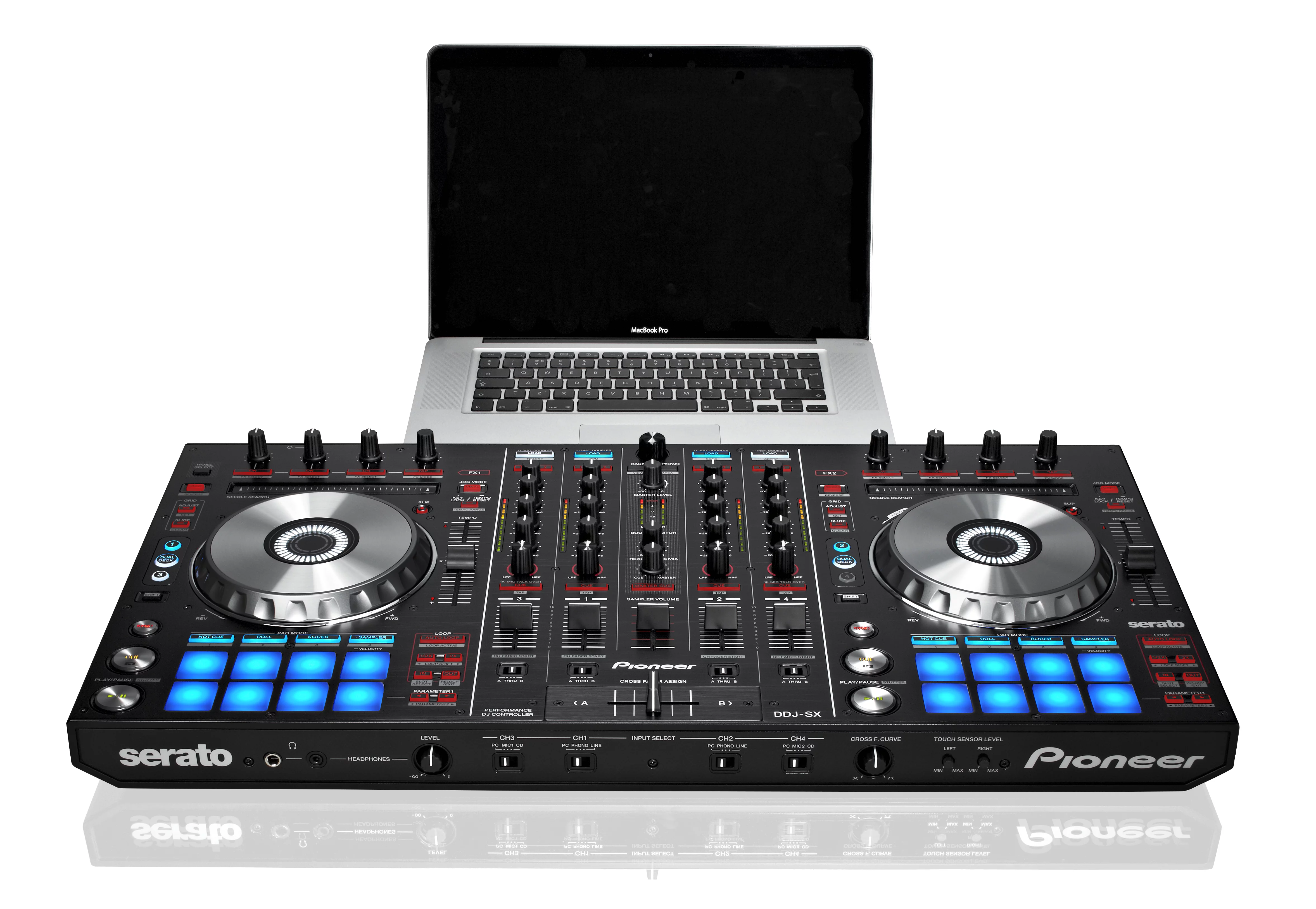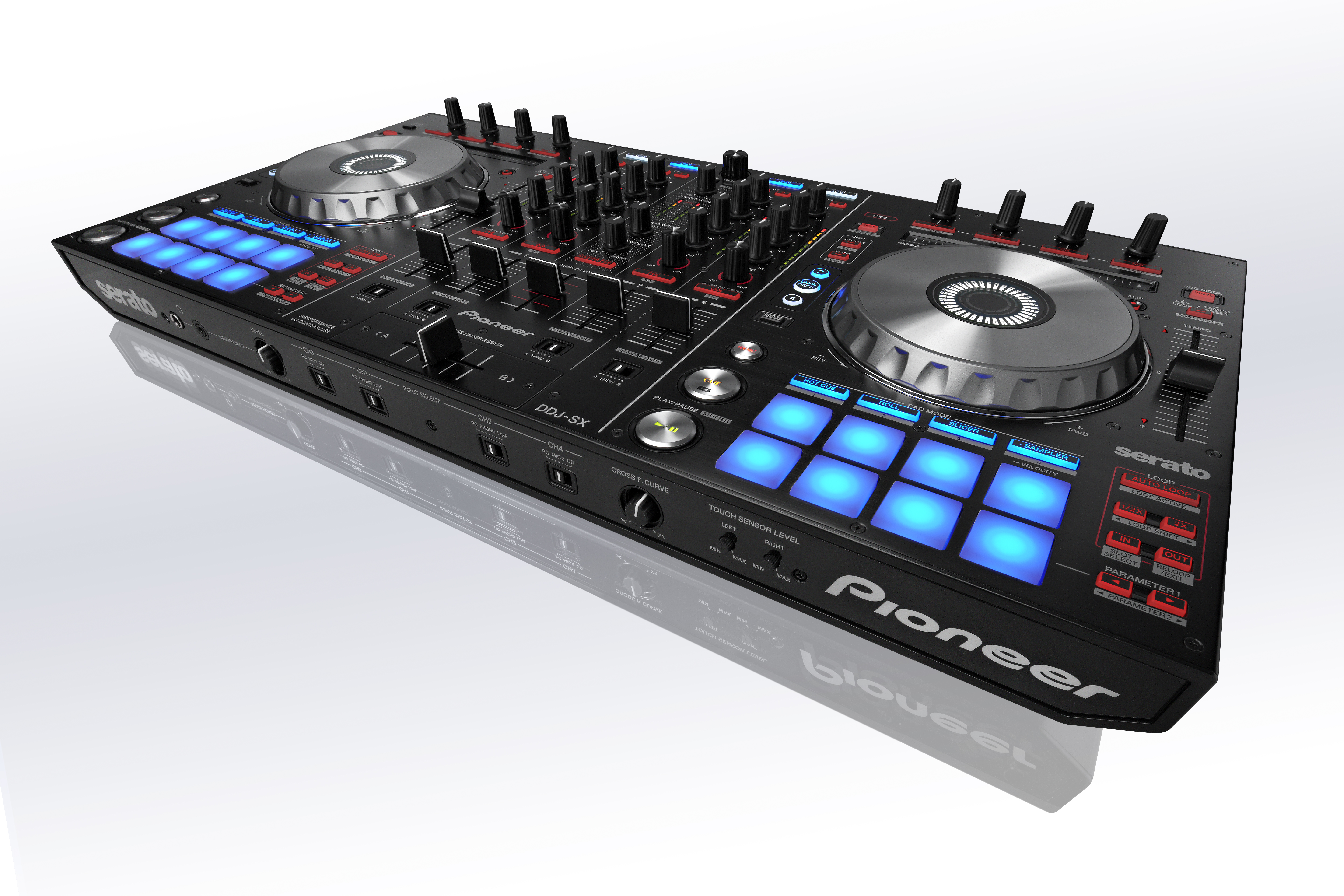 DDJ-SX унаследовал уже знакомое расположение элементов управления от популярных контроллеров линейки Pioneer, но с некоторыми обновлениями для более интересных экспериментов. Профессиональные диджеи могут использовать комбинации кнопок, регуляторов, фейдеров, джогов и секцию «Performance Pads» для придания сету своего неповторимого почерка.