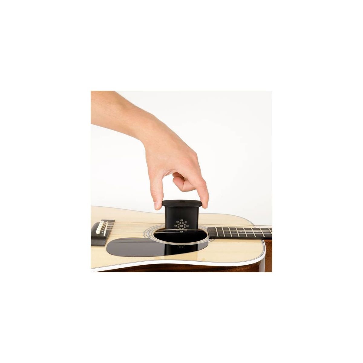 Подвешенный на струнах, увлажнитель равномерно выпускает влагу внутри корпуса гитары, но не касается самого инструмента.