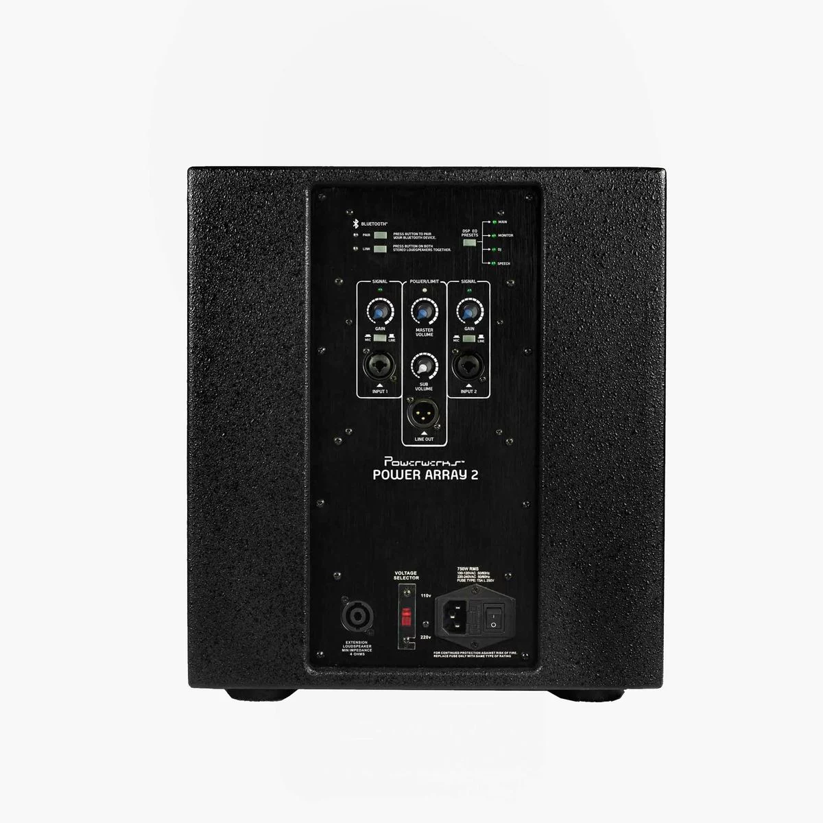 Powerwerks Power Array 2 имеет четыре режима предустановок встроенного DSP-эквалайзера, регулируемую громкость сабвуфера для управления общим выходным миксом и выход XLR,