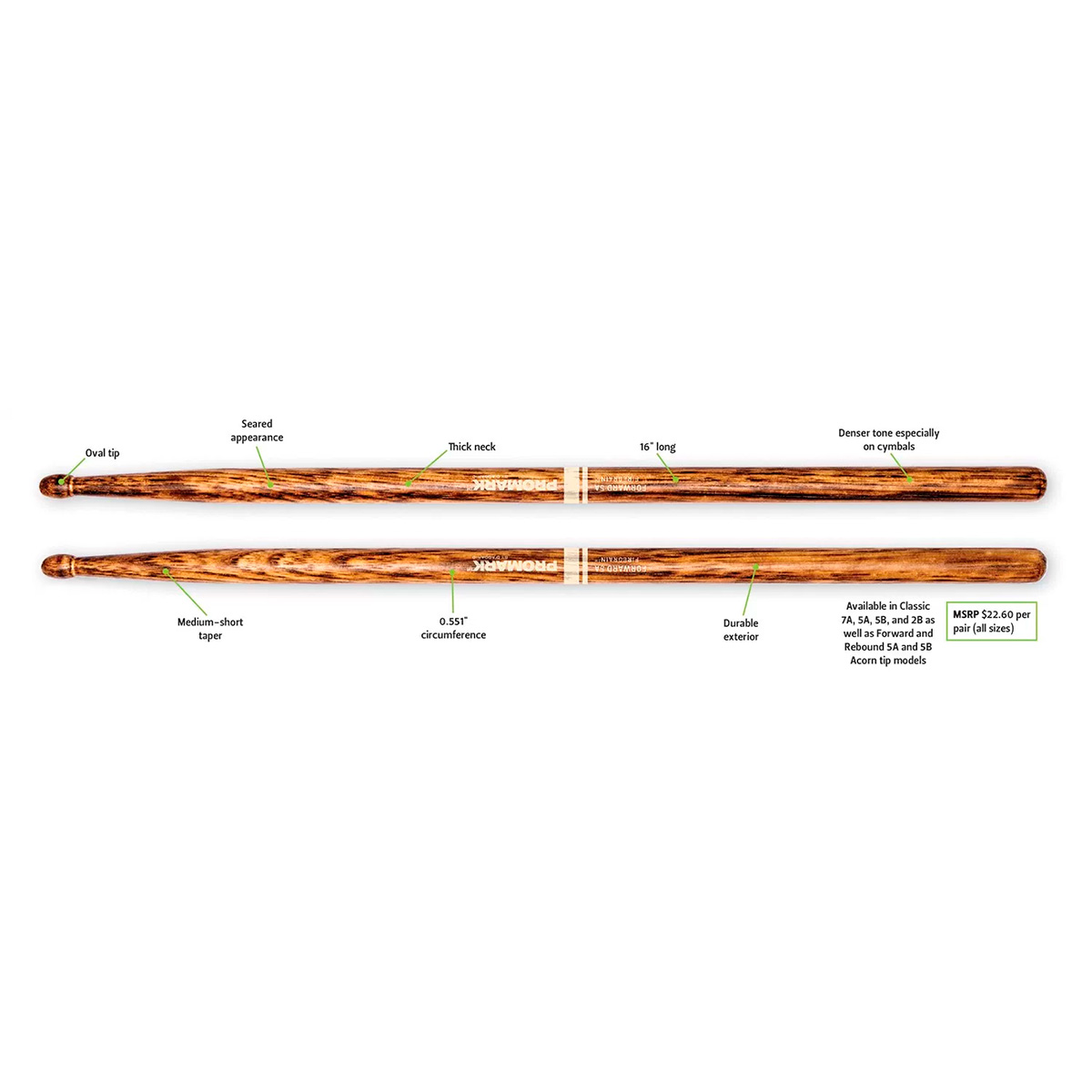 Барабанные палочки, орех, серия Firegrain, модель 5B. Центр тяжести смещён назад.