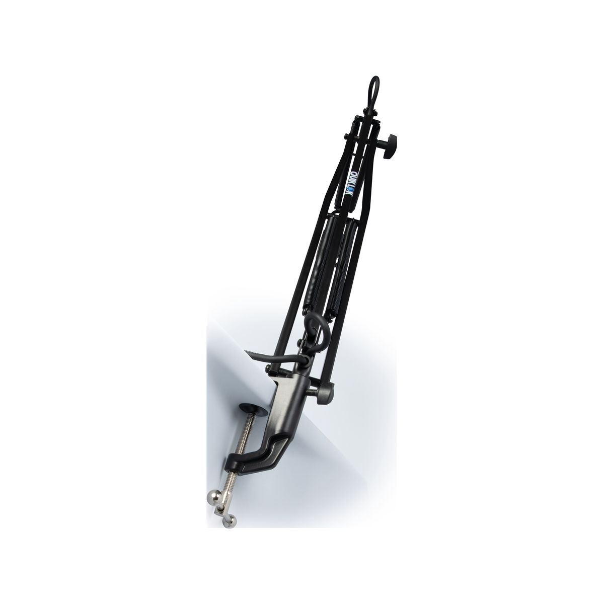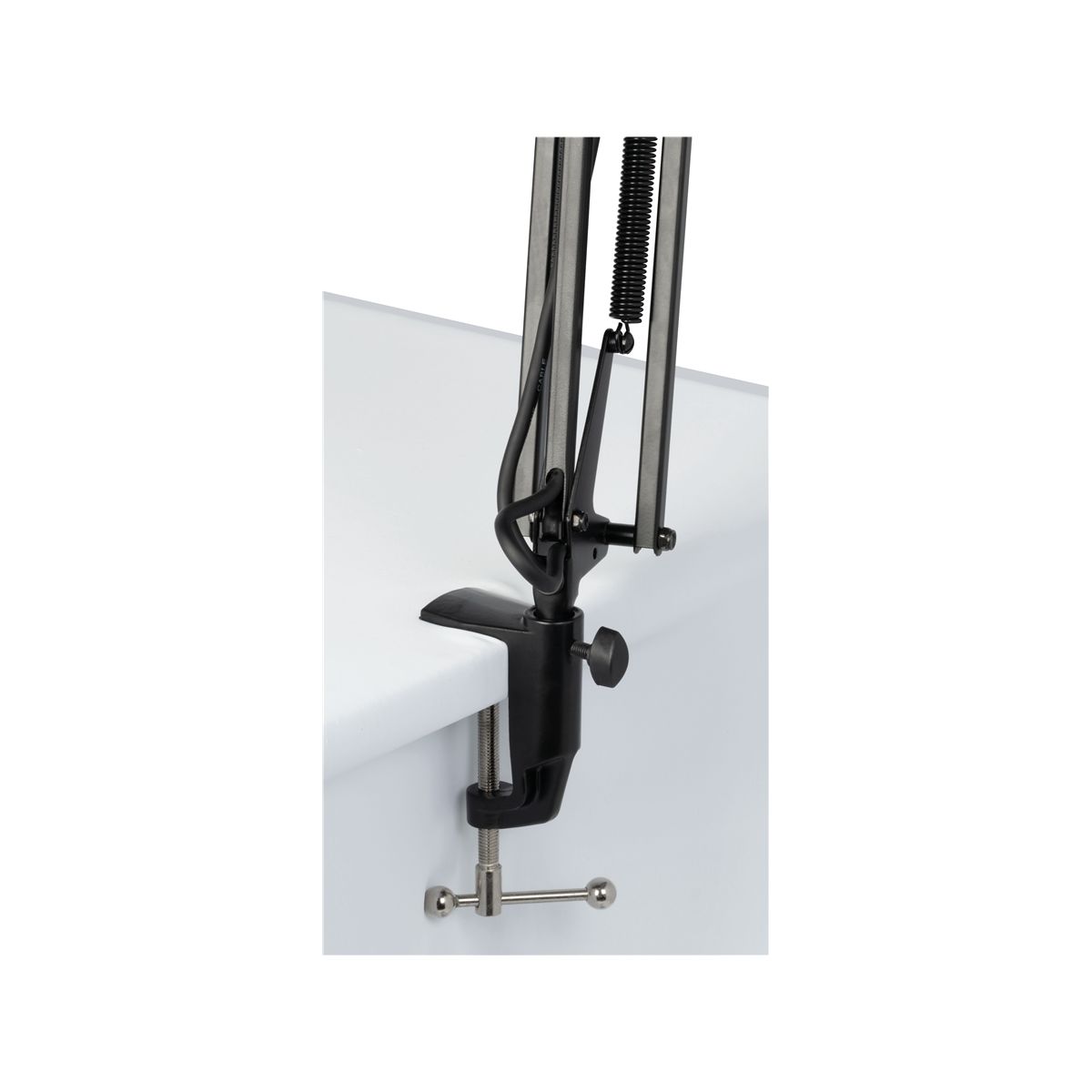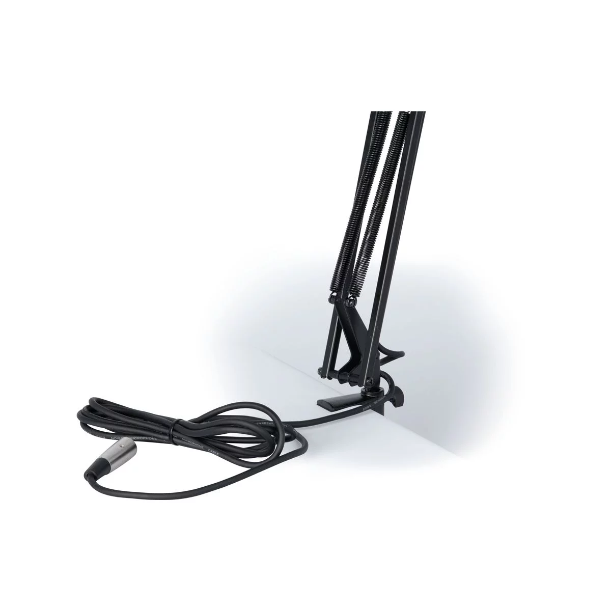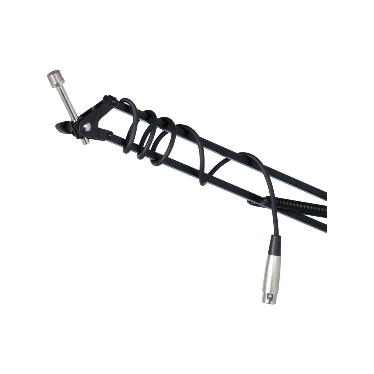Главной особенностью модели является подвижное колено, позволяющее быстро и легко изменять угол наклона и регулировать длину стойки. Кроме того среди достоинств стоит отметить наличие микрофонного XLR кабеля и специальный зажим-струбцину, позволяющий закрепить стойку на любой поверхности толщиной до 50 мм.