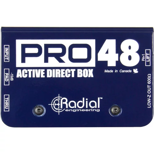 Radial Pro48 - активный директ-бокс . Он отличается высокими характеристиками и широкми динамическим диапазоном. Патентованная схема внутреннего питания делает Pro48 идеальным кандидатом для использования с активными инструментами, напримеро басом и акустической гитарой, предусилители которых, своим высоким выходным уровнем пергружают другие ди-боксы.