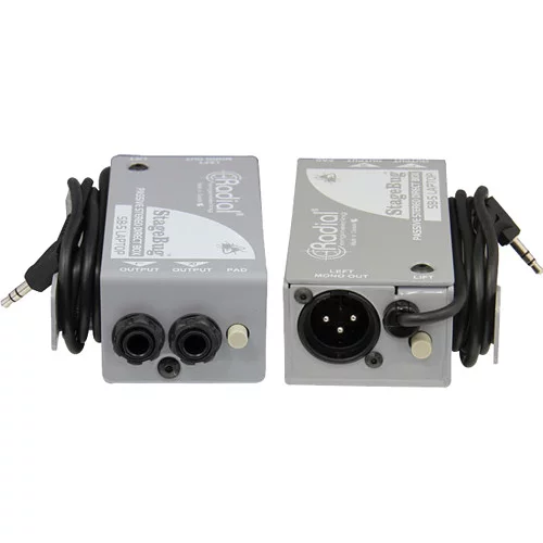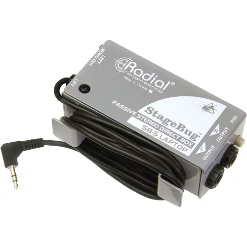 Radial SB-5 - компактный стерео директ-бокс, предназначенный для подключения портативных компьютеров, планшетов и других бытовых аудиосистем для усиления сигнала через профессиональную аппаратуру.