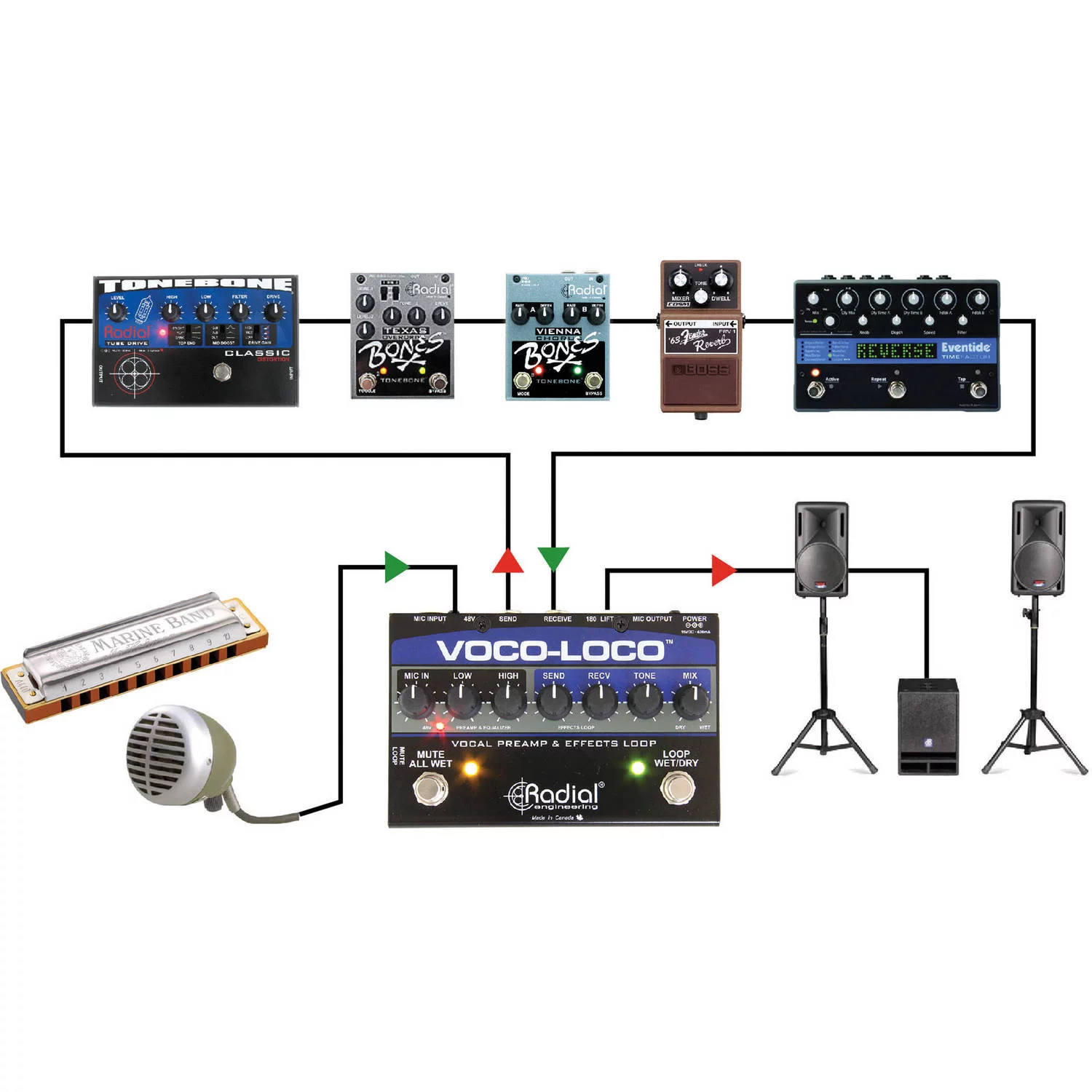 VOKO-LOCO - микрофонный предусилитель с петлёй эффектов с ножным управлением, позволяющий ведущим вокалистам, музыкантам включать гитарные педали эффектов в цепь сигнала, так же, как электро гитарист добавляет эффекты для соло. Встроенное фантомное питание 48 В позволяет использовать конденсаторные микрофоны, Регулировки позволяют корректировать тембры сигнала, а также смешение исходного сигнала с сигналом эффектов.