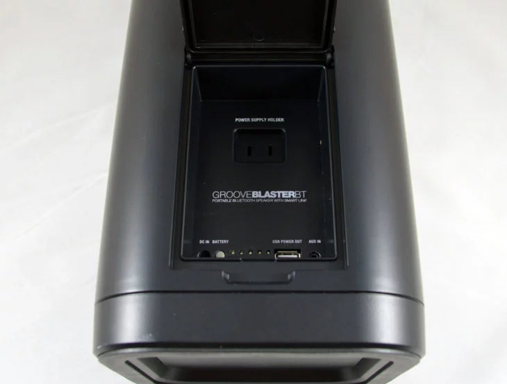 В дополнение к функции отображения текущего уровня заряда батареи и подключения к сети, задняя панель акустической системы оснащена отделением для адаптера, которое можно использовать для хранения блока питания.