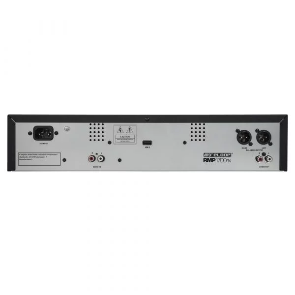 RMP-1700RX это проигрыватель CD с фронтальной загрузкой, оснащенный 2 USB-портами для воспроизведения и записи MP3/WAV файлов. Он также оснащен дополнительным RCA-входом для записи с внешних источников. Выходы прибора как балансные (XLR), так и небалансные (RCA)