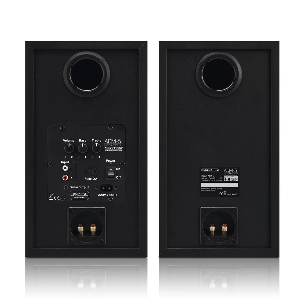 Активные мониторы ADM-5 от Reloop – идеальное решение для любой домашней DJ-студии. Не важно, занимаетесь ли вы сведением через DVS или DJ-контроллер, или же вам нужен просто монитор для домашнего DJ-сэта – ADM-5 позволяют получить мощный звук при компактных размерах. Частотный диапазон 35 Hz - 20 kHz дает достойное звучание, при котором каждый бас и каждый пик отражаются максимально точно. Полные 30 Ватт мощности обеспечивают полное звуковое погружение при любом миксе. В то время, как много мониторов делаются из пластика, корпус ADM-5 сделан из высококачественной древесины, что дает достаточный баланс – и, конечно, вы можете подстроить ВЧ и НЧ раздельными регуляторами. Басовые динамики с магнитной экранировкой можно ставить рядом с компьютером без опасения наводок.