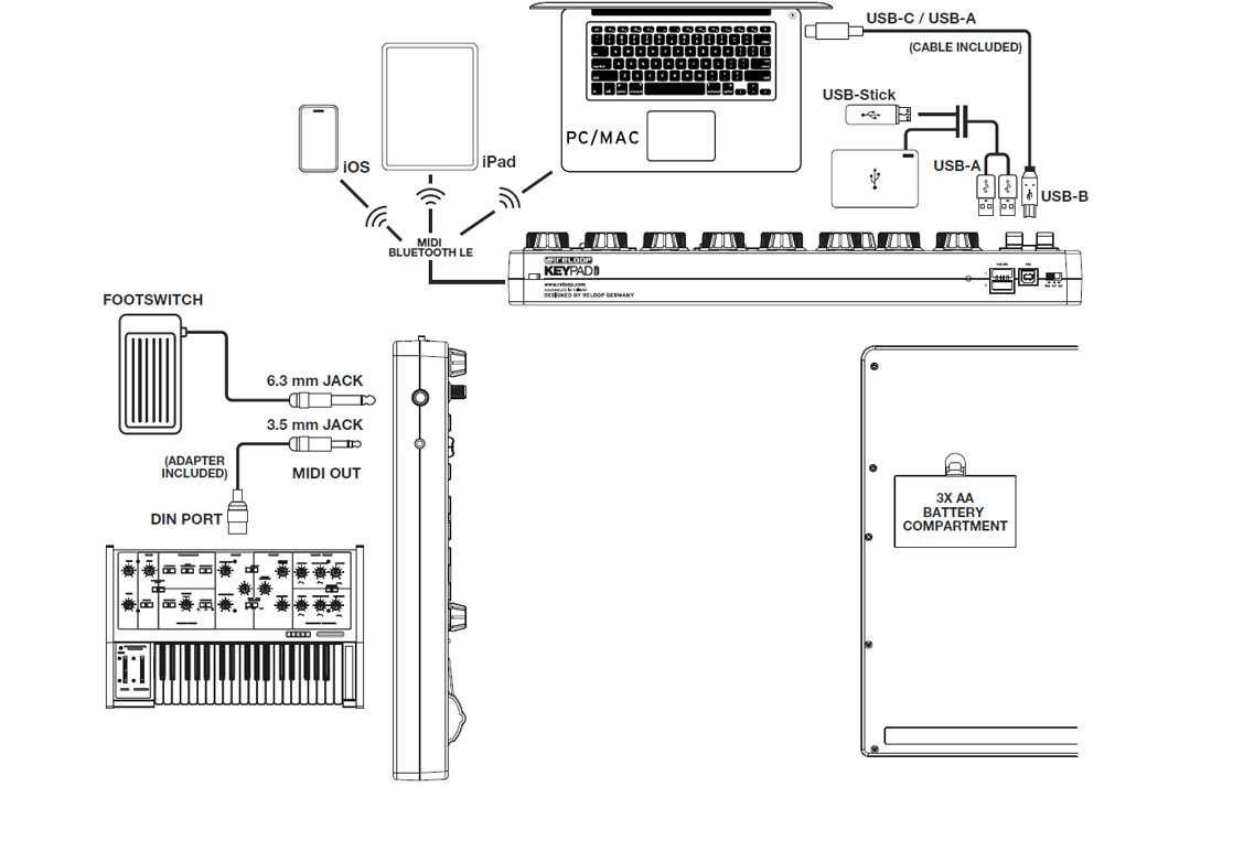 Компактная рабочая станция DAW может работать как от USB, так и от батареек, что делает её идеальным решением для мобильных студий или живых проектов. Кроме того, Keypad Pro также поддерживает как проводное (через USB), так и беспроводное (через Bluetooth) подключение к основным компьютерам и интеллектуальным устройствам (через беспроводной MIDI).