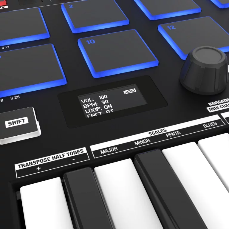 Шестнадцать пэдов, чувствительных к скорости, обеспечивают максимальную творческую гибкость при составлении битов, а также могут использоваться для управления или изменения программ для активации определенных эффектов или плагинов. Впечатляющая запись еще более усиливается благодаря функции послекасания и RGB-подсветке. Секция барабанных сэмплов также может использоваться для запуска клипов (воспроизведения и остановки) во время сеанса работы над проектом.