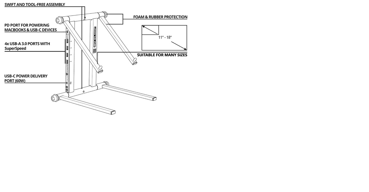Макбуки и ноутбуки с подключением по USB-C могут питаться напрямую от стойки Stand Hub через порт USB-C PD. Работает как активный или пассивный USB-C / USB-A хаб со всеми ноутбуками.