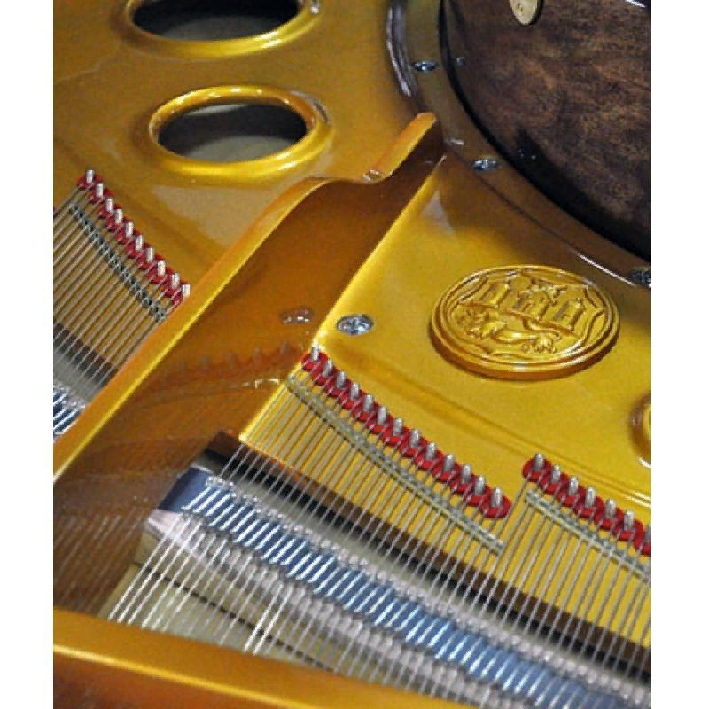 Рама рояля отлита из чугуна, а колки изготовлены из немецкой никелированной стали – это говорит о высокой точности и прочности инструмента, его способности удерживать изначальные настройки предельно долго.