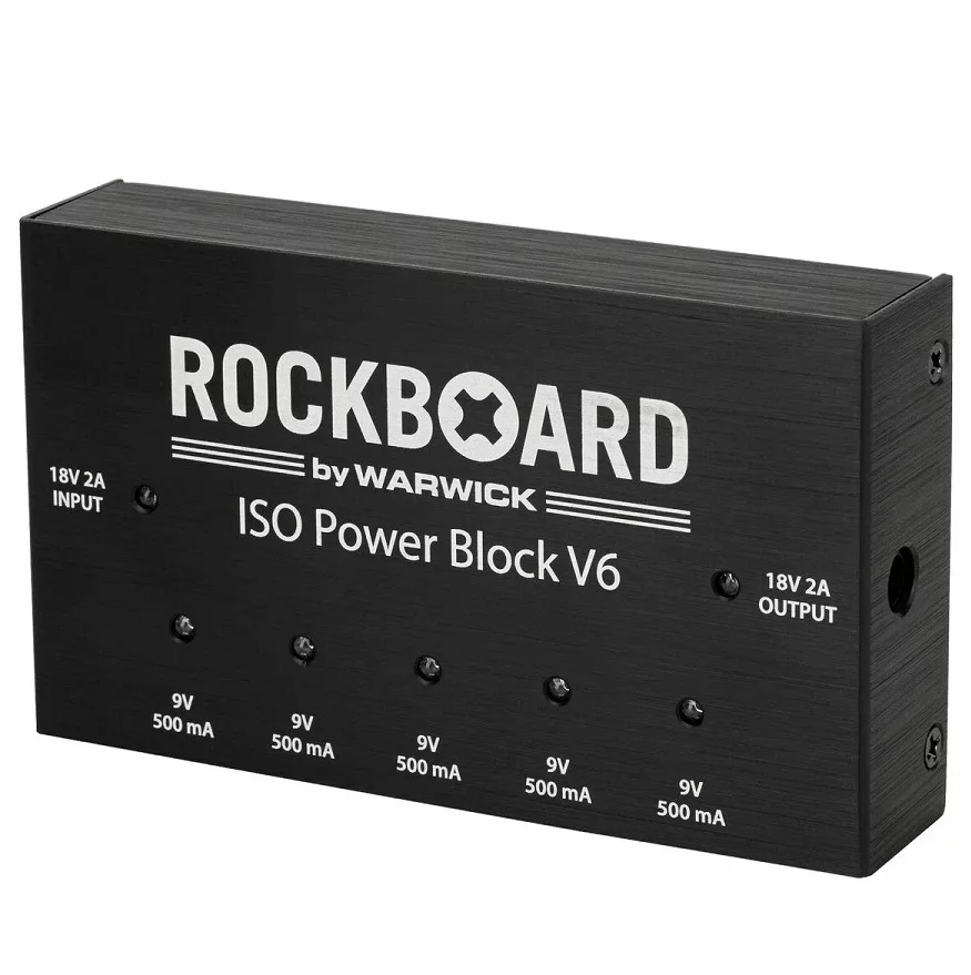 RockBoard ISO Power Block V6 - это многофункциональный источник питания для педалей эффектов с 5 изолированными разъемами питания 9 В постоянного тока и одним выходом 18 В постоянного тока для последовательного подключения нескольких блоков питания ISO V6 для больших настроек. Передовая технология фильтрации, используемая в разъемах питания постоянного тока напряжением 9 В. Подключенные педали эффектов защищены в случае короткого замыкания.