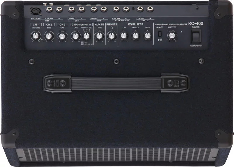 KC-400 — компактный комбо с плотным, пробивным полнодиапазонным звуком мощностью 150 ватт. Двойная фазоинвертерная конструкция кабинета, запатентованная компанией Roland, позволяет расширить диапазон воспроизводящихся без искажения низких частот. Модернизированная секция усиления КС-400 обеспечивает более качественное воспроизведение низов, что позволяет добиваться превосходного звучания при усилении сигналов 88-клавишных сценических пианино, органов, синтезаторов, драм-машин и других электронных инструментов. Еще одним дивидендом эффективной конструкции секции усиления стало снижение веса, облегчающее транспортировку КС-400.