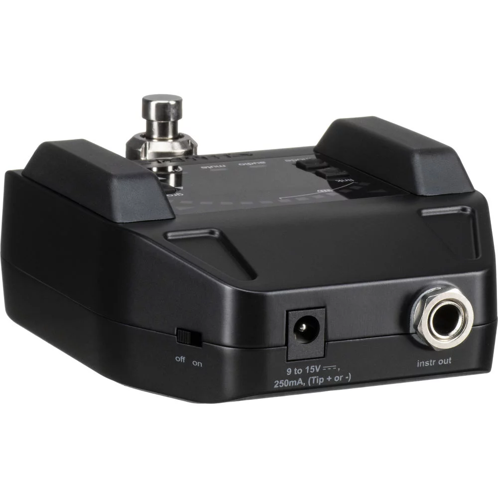 Сверху педали располагается футсвитч, нажатием на который GLXD6 можно переключить в режим приемника или в режим тюнера. Также сверху расположен дисплей, на котором наглядно отображаются настройки приемника и передатчика, включая индикатор зарядо батареи. По бокам размещены кнопка включения и USB порт. Разъем для подключения электропитания и аудио выход находятся в торцевой части.