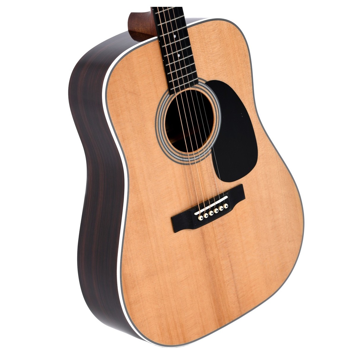 Электроакустическая гитара со звукоснимателем. Тип корпуса дредноут. Верхняя дека Массив ситхинской ели. Задняя дека и обечайки Тилия. Гриф Красное дерево. Струны D Addario EXP16.