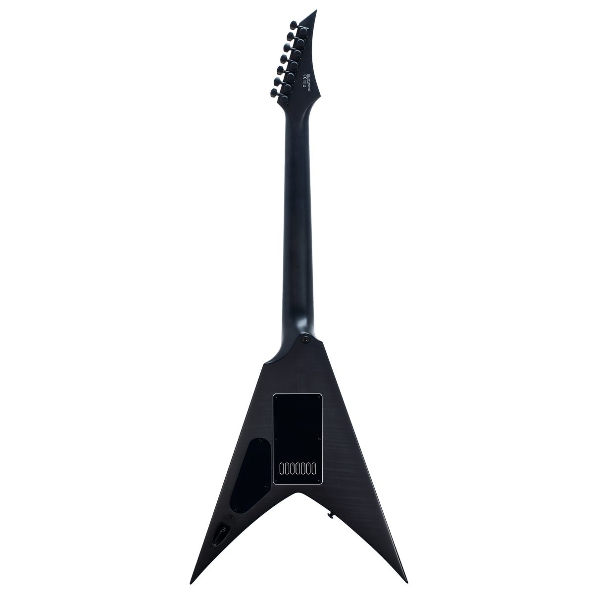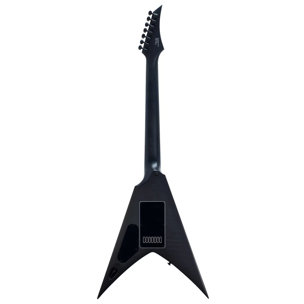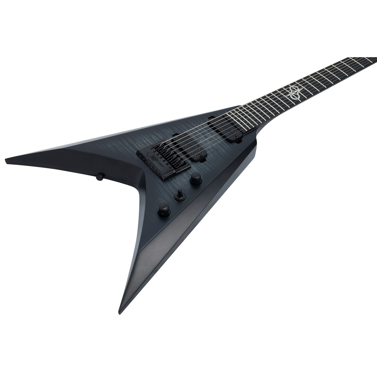 7-струнная электрогитара, форма V, гриф - клен с накладкой из черного дерева, корпус - махагони, звукосниматели - хамбакеры Duncan Solar, бридж - Evertune, чехол, цвет черный берст.