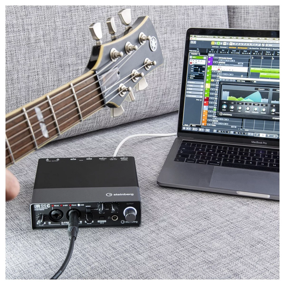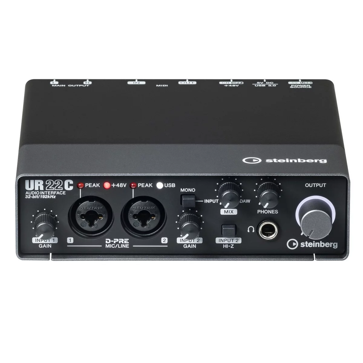 Steinberg UR22 это традиционный USB-интерфейс не имеющий дополнительной интеграции с приложениями Steinberg - решение для музыкантов не привязанное к хостам и платформам. Новый интерфейс является USB звуковой картой, в классическом смысле этого понятия. В панели управления устройством можно выбрать размер буфера и частоту дискретизации, все остальные параметры изменяются с помощью аппаратных регуляторов, находящихся на лицевой стороне устройства. Регулятор MIX позволяет настраивать громкости аппаратного мониторинга входящего сигнала. Выход на наушники регулируется отдельно от общей громкости. Стоит отметить, что выход на наушники имеет большой запас по мощности. В UR22 используются микрофонные предустилители Yamaha D-PRE. Каждый усилитель представляет дифференциальный каскад на составных транзисторах, работающий совместно с малошумящим операционным усилителем. Составной транзитор используется для увеличения коэффициента усиления и получения высокого входного импеданса.