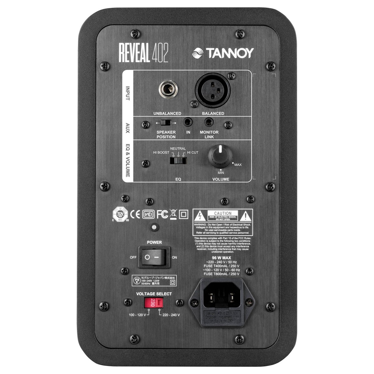 Tannoy Reveal 402 - студийный монитор ближней зоны, предназначенный для использования в персональных домашних студий. Reveal 402 оснащен высокоэффективным низкочастотным динамиком 4", 3,4" твитером с мягким куполом и позиционируется как компактное решение для малых помещений и площадей, где требуется расширенный диапазон сбалансированного звука. Мощный Bi-amp усилитель в 50 Вт и активный кроссовер обеспечивают мощный и сбалансированный звук на любых уровнях громкости. Тонко настроенные фильтры кроссовера, в создании которых участвовал знаменитый Пол Милс (Dr. Paul Mills), обеспечат наиболее комфортное восприятие звука, чтобы слушатели могли передвигаться по аудитории или рабочей студии, не теряя стерео-образа собственных миксов.