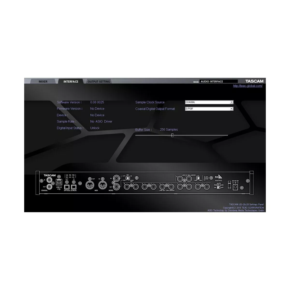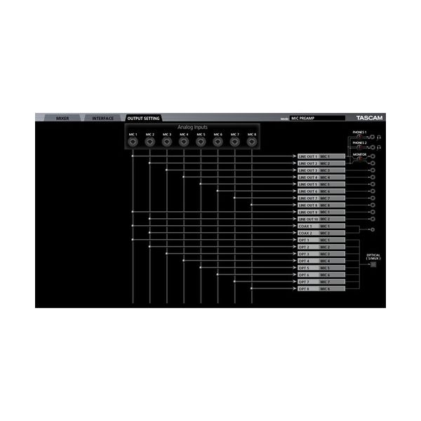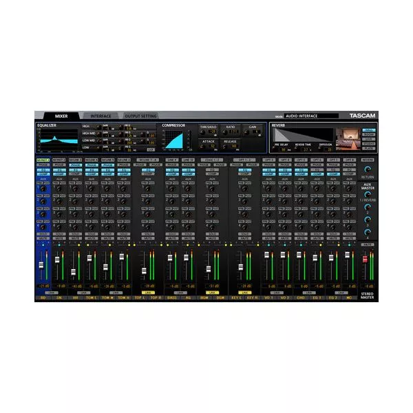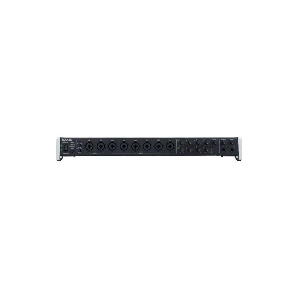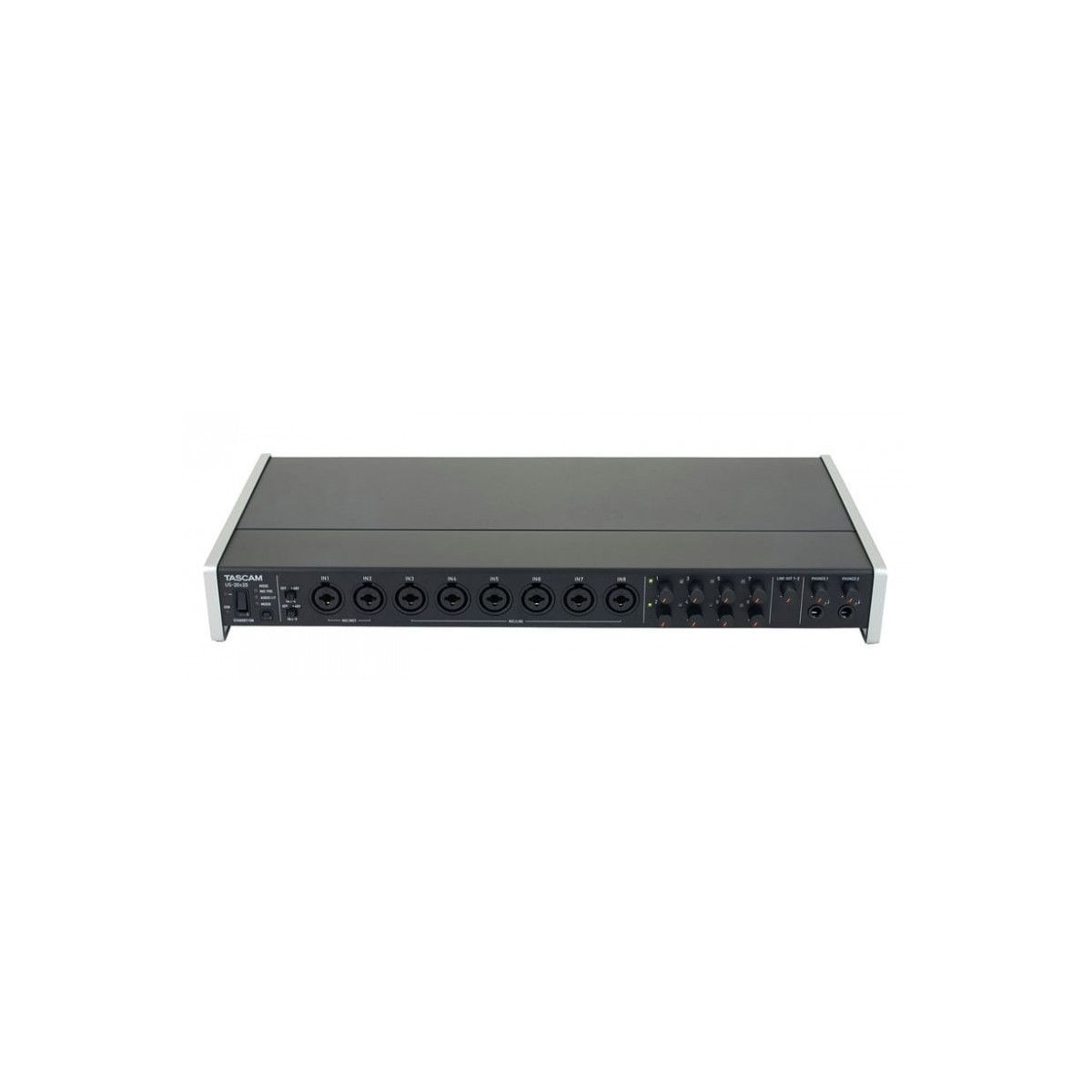 Tascam US-20*20 — 20-канальный звуковой интерфейс для шины USB 3.0. Данный продукт является флагманской моделью в своей линейке и предназначен для использования в профессиональных студиях. Устройство поддерживает частоты дискретизации до 192 кГц при подключении к порту USB 3.0 и может работать в нескольких режимах, что делает её весьма универсальным устройством, в том числе для многоканальной записи.