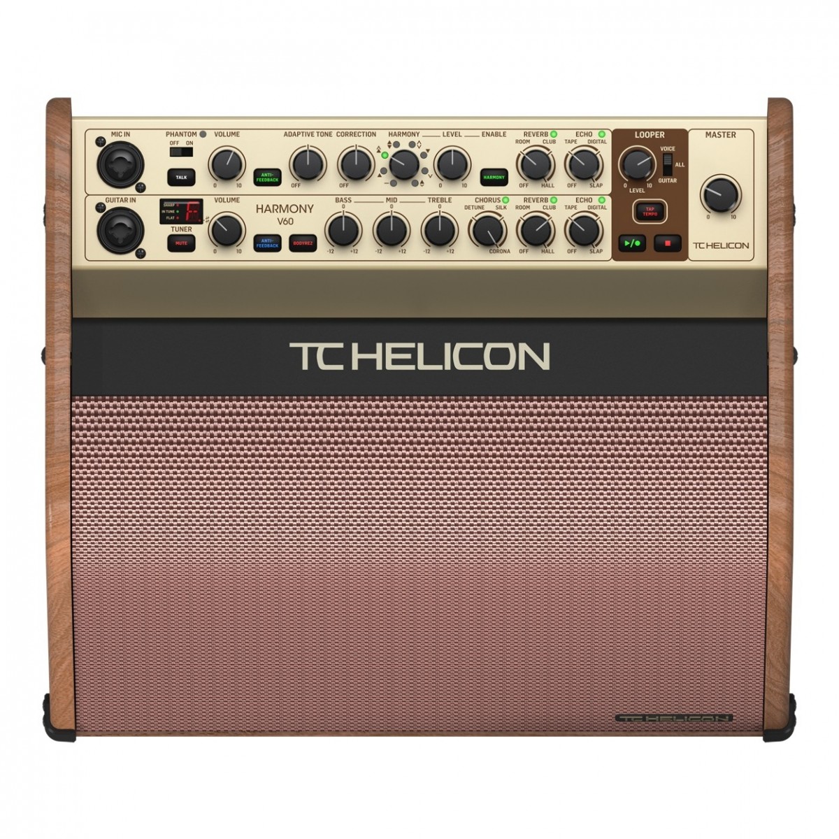 - Канал Guitar оснащён 3-полосным эквалайзером, а также тюнером и встроенным эффектами TC HELICON: BodyRez, Intelligent Anti-Feedback, Reverb, Delay, Chorus