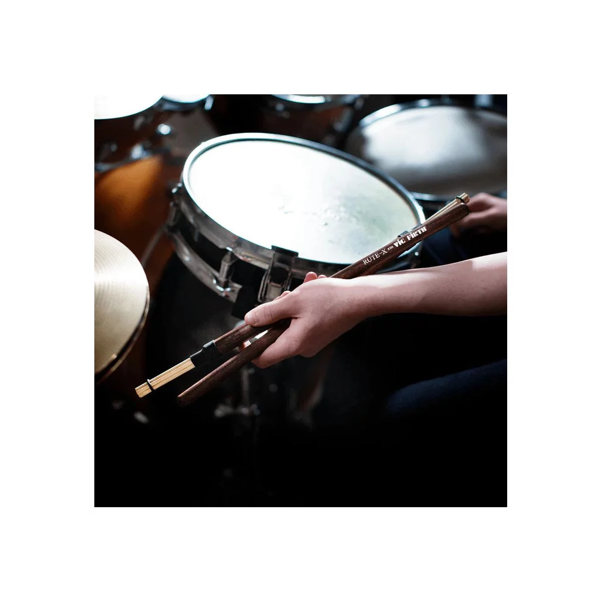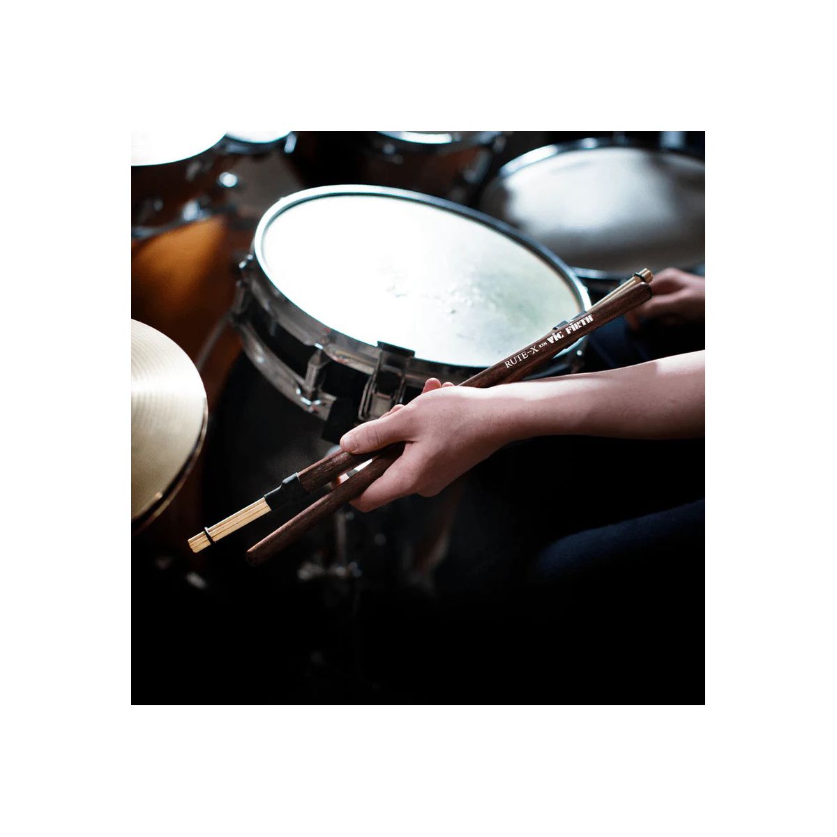Ощущения и отклик барабанной палочки с контролем громкости и разным звучанием в зависимости от типа стержней. Гибридные щётки Vic Firth RUTE-X предлагают беспрецедентную динамическую универсальность, мощные рим-шоты и кросс-стики, которые невозможно получить с помощью традиционных аналогичных продуктов. Идеально подойдут для работы в студии, занятий и везде, где необходим низкий уровень громкости звучания барабанов. Доступно 4 модели: жёсткие, средние, мягкие с стержнями из высококачественной берёзы, а также из долговечного пластика.