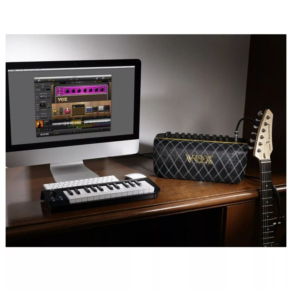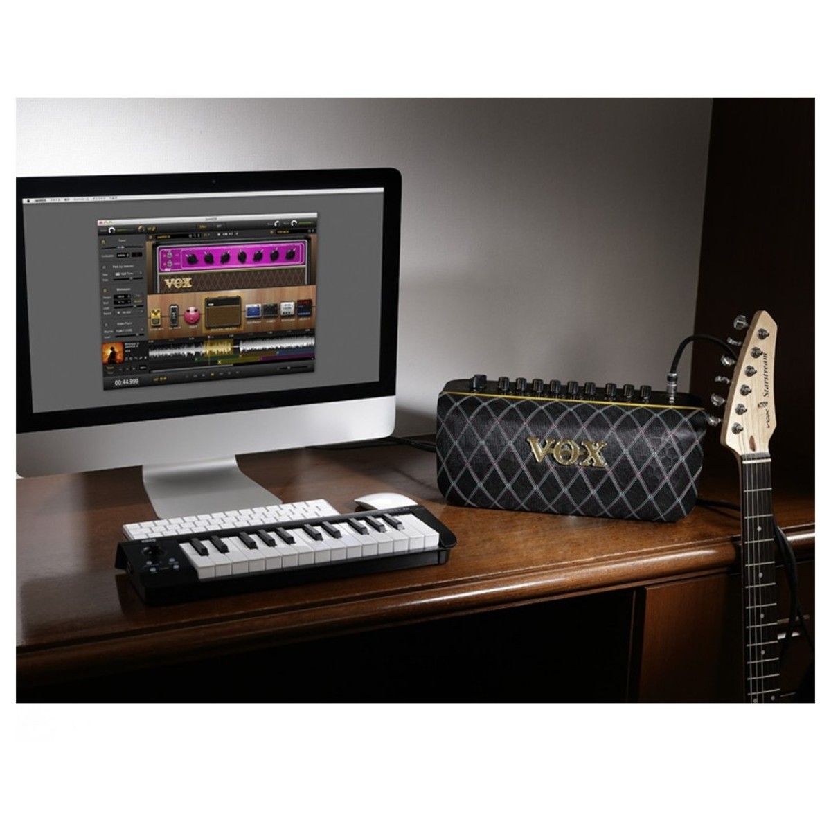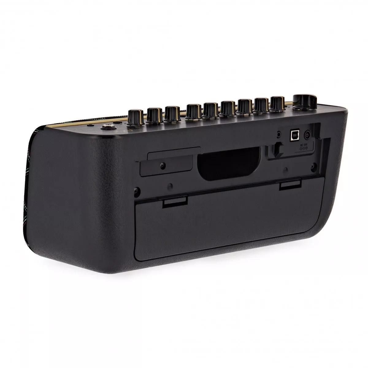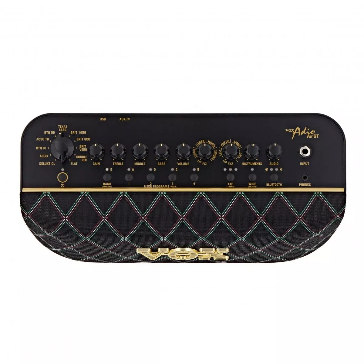 VOX ADIO-AIR-GT – компактный и лёгкий современный моделирующий усилитель, выдающий впечатляющую для своего размера мощность 50 Ватт с двумя 3-дюймовыми динамиками. Громкий и мощный выходной сигнал этого усилителя превосходит все аналогичные модели в своём классе. Эта модель прекрасно подойдет как для самостоятельных занятий, так и для выступлений. Adio Air GT может моделировать 11 различных усилителей, или 17 с использованием программного обеспечения Tone Room. Предусмотрено два набора эффектов, по 4 эффекта в каждом (или 11 и 8 соответственно с применением Tone Room). Можно использовать до 8 пользовательских настроек - два банка по 4. Дополнительно имеются отключаемые эффекты: Wide Stereo, четырёхступенчатый подавитель шума, а также эквалайзер. Возможности коммутации предусматривают инструментальный вход (джек), вход AUX (джек), разъем для подключения наушников и USB порт. Кроме того, есть возможность беспроводного соединения по Bluetooth, в том числе поддерживается Bluetooth MIDI. Adio Air GT может работать полностью автономно от 8 батарей АА. В комплекте поставляется адаптер переменного тока и кабель для подключения к электросети, а также карта для загрузки ПО JamVOX III. Вес модели – 2,9 кг.