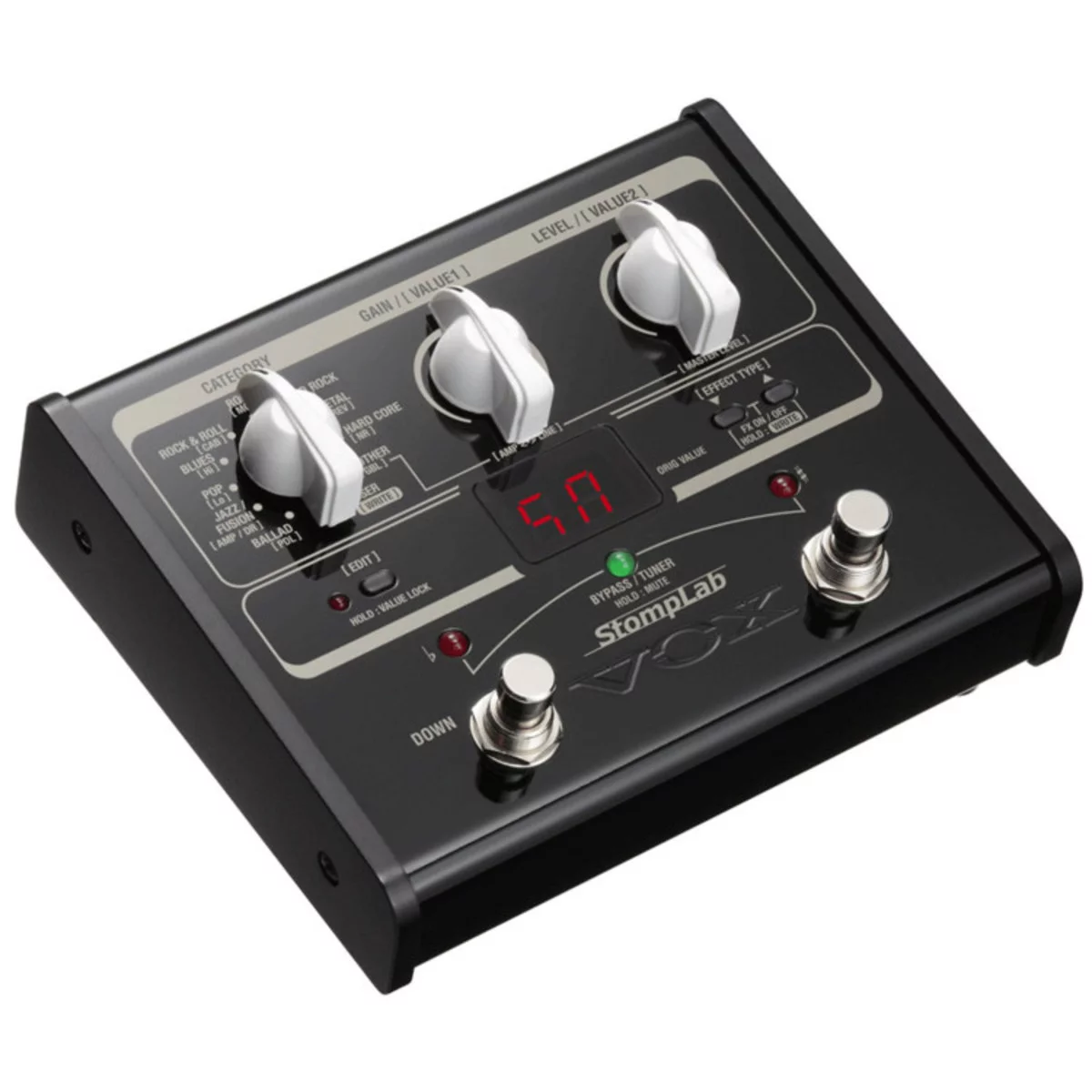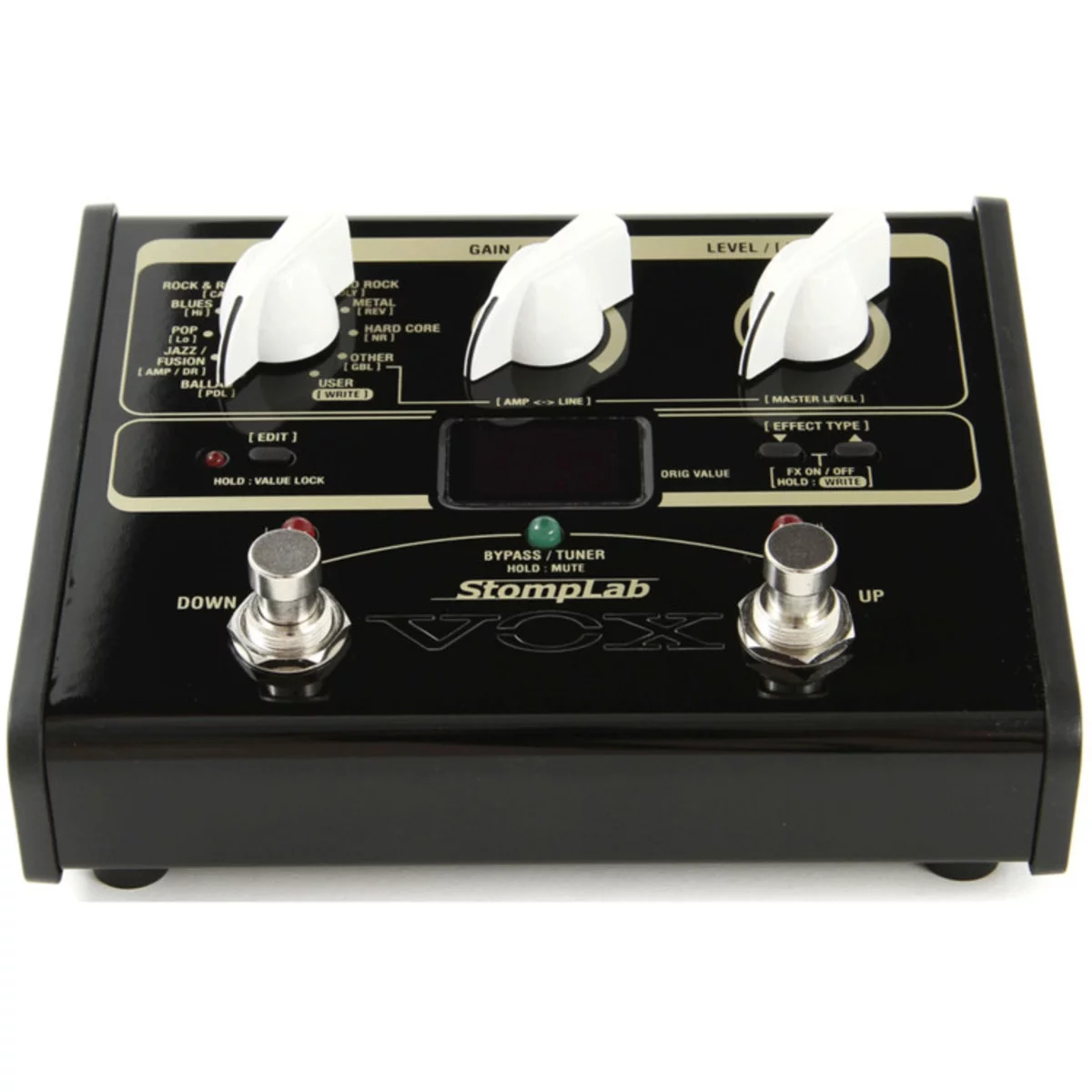 Педали мультиэффектов отличаются невероятным разнообразием тембров — от перегруженных до чистых, причем количество возможных комбинаций просто потрясает. Однако, хотя наличие большого количества тембров — огромное преимущество, оно может сбить с толку неопытного пользователя и вызвать у него затруднения при работе с прибором. Педали серии StompLab не только мощны, но и исключительно просты — с ними легко справится даже начинающий. Поскольку каждая пресетная программа содержит название соответствующего музыкального стиля (например, рок, блюз или металл), вы с легкостью отыщете звук, идеально подходящий для вашей композиции. Музыкальные стили разбиты на десять категорий и содержат множество разнообразных тембров — от традиционных до фантастических экспериментальных. Для каждой категории доступно 10 вариаций тембра, таким образом, исполнитель всегда отыщет нужное ему звучание.