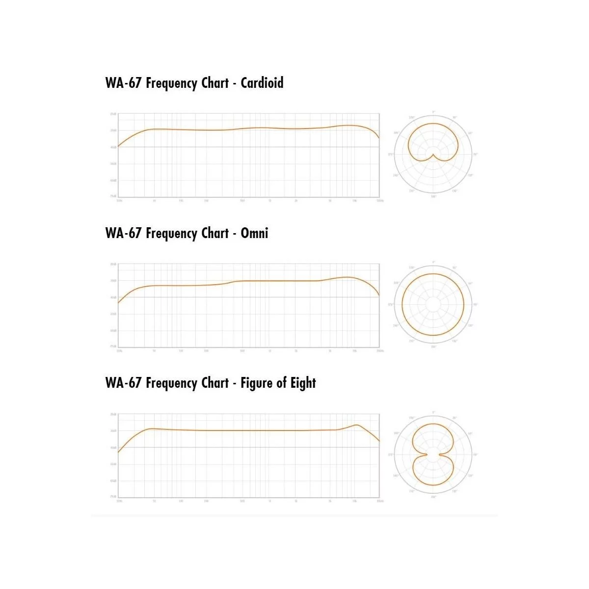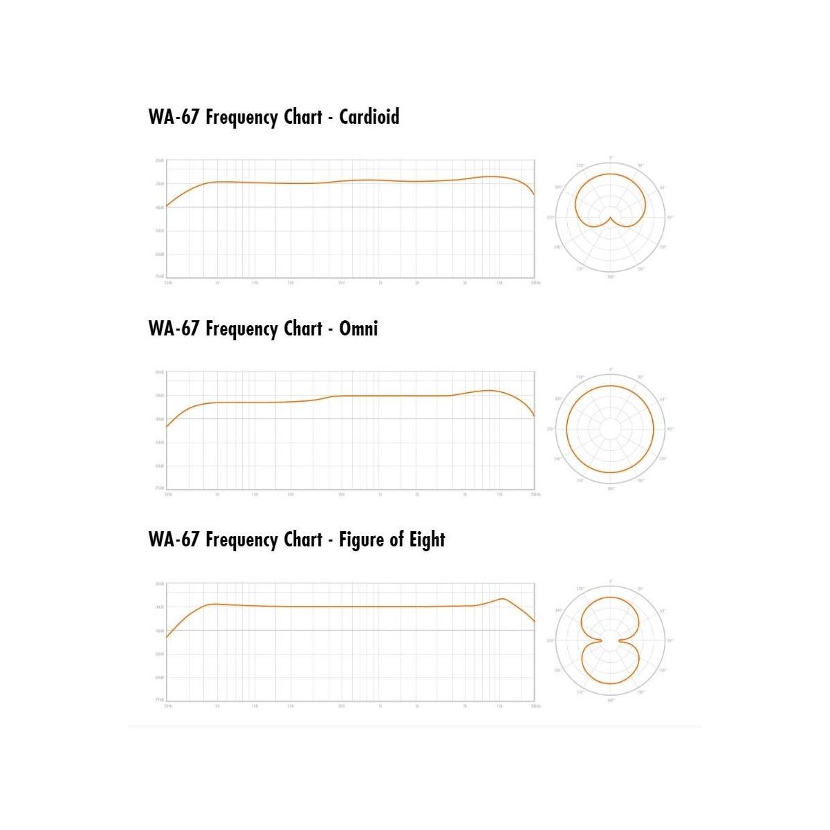 Warm Audio WA-67 представляет собой конденсаторный ламповый микрофон с большой диафрагмой, который имеет 3 диаграммы направленности (кардиоида, всенаправленная, восьмерка). Модель разработана с использованием высококачественных комплектующих, большинство из которых были выполнены под заказ. В WA-67 используется лампа EF86, трансформатор Lundahl, конденсаторы Wima/Solen и специально спроектированный латунный капсюль с диафрагмой, имеющей золотое напыление. Микрофон также обладает прочным корпусом, который изготовлен из никелированной латуни.