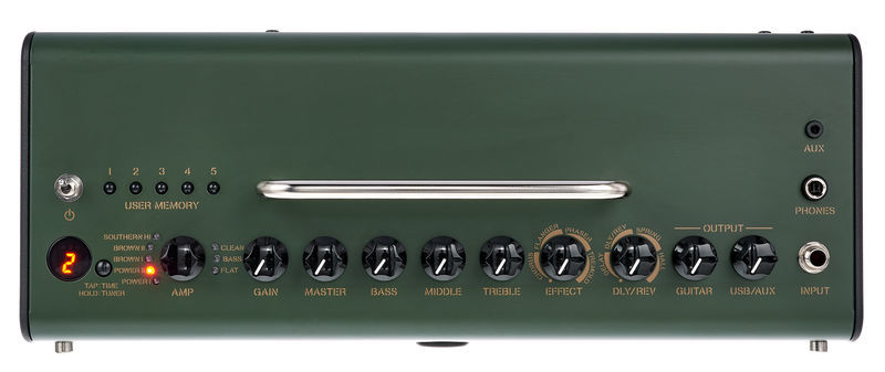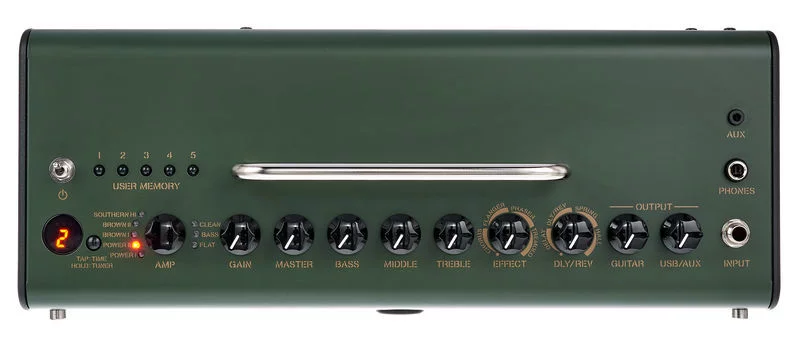 Регулировки: AMP, GAIN, MASTER, BASS, MIDDLE, TREBLE, EFFECT, DLY/REV, GUITAR OUTPUT, USB/AUX OUTPUT, USER MEMORY Switch x 5, TAP/TUNER Switch;