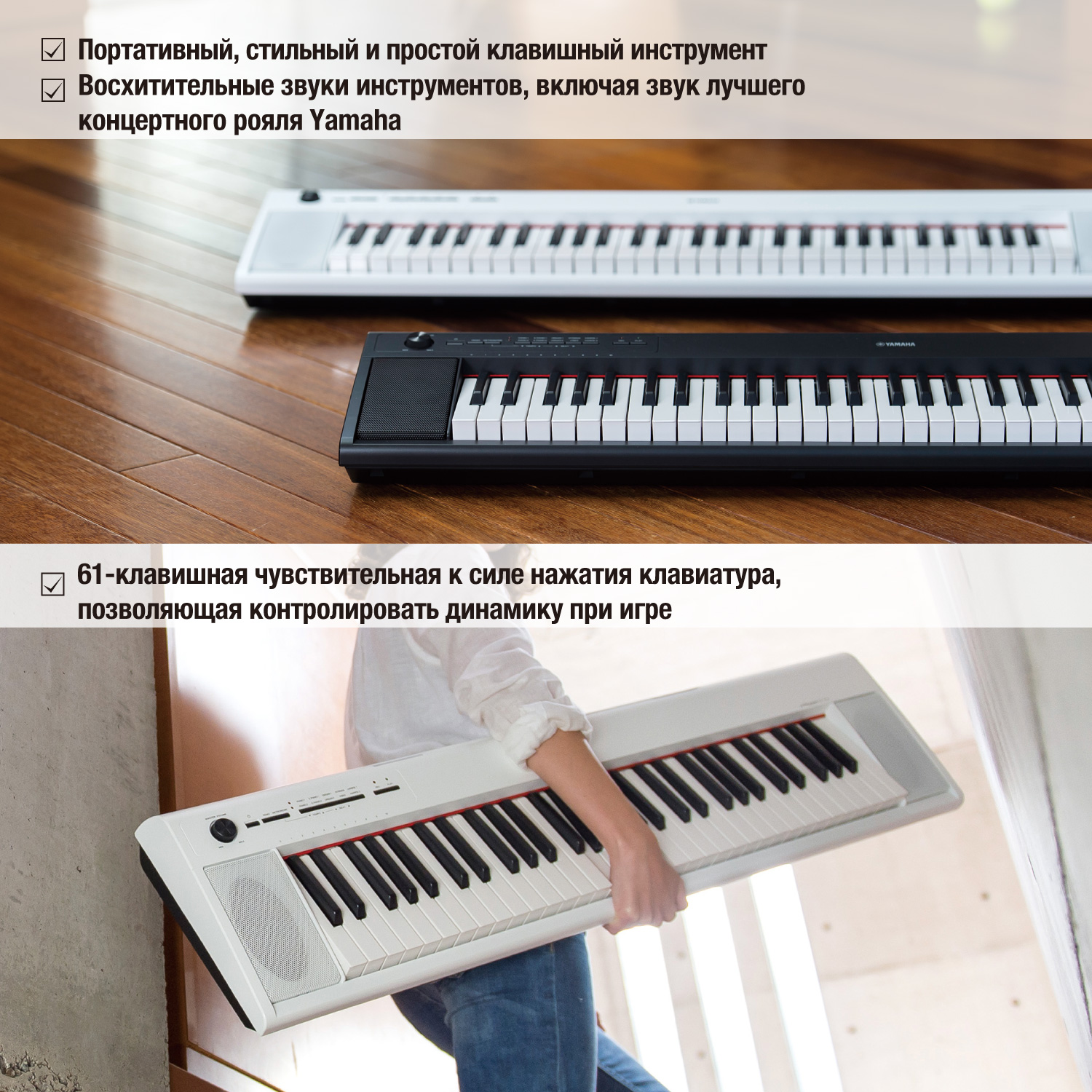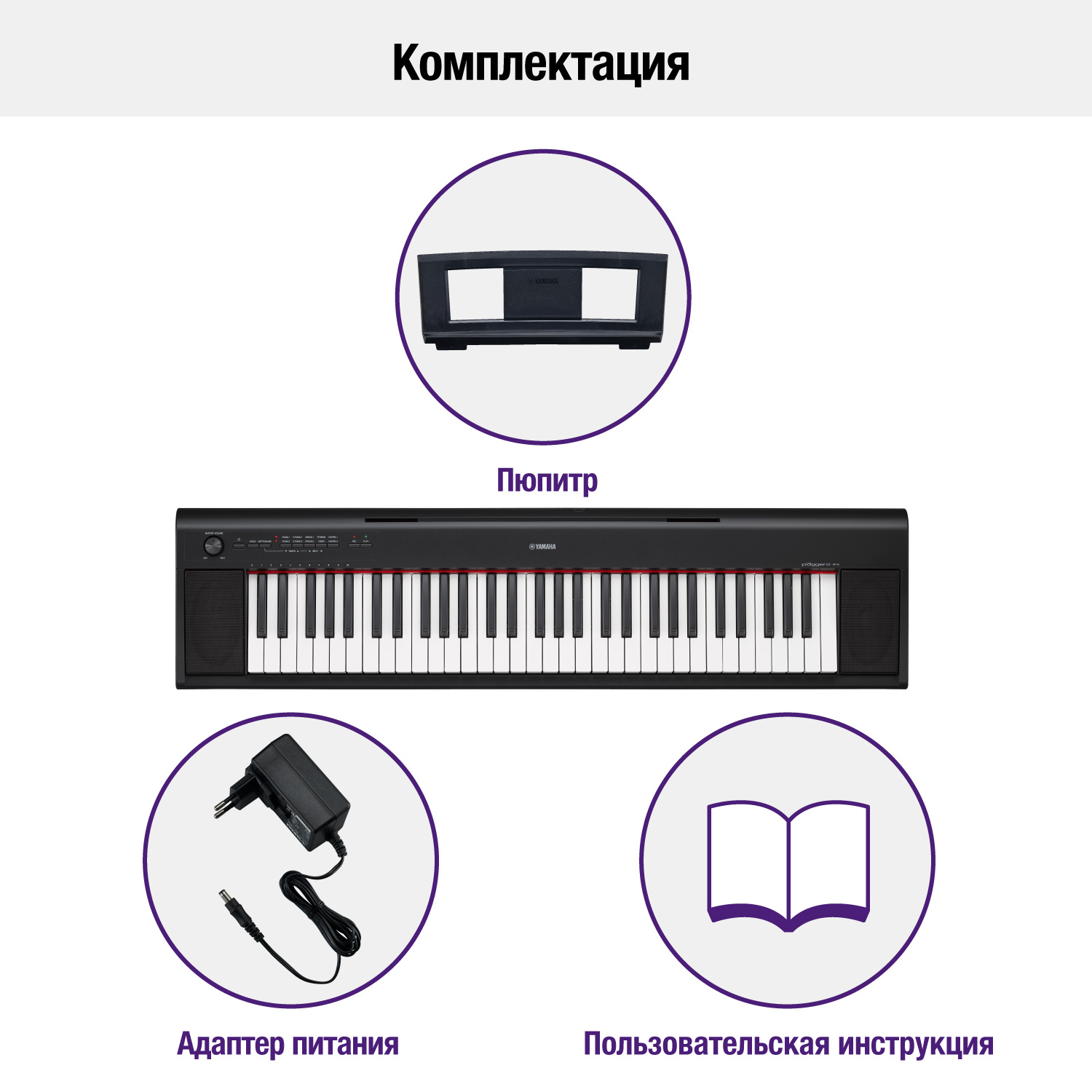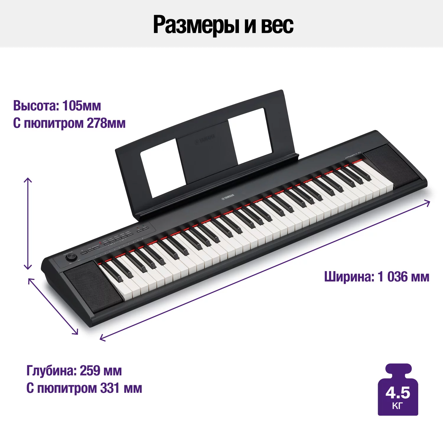 Электронное фортепиано Yamaha NP-12B имеет динамическую и неградуированную клавиатуру на 61 полноразмерную клавишу. Поэтому тактильные восприятия будут несколько разниться от привычной манеры игры на классических клавишных инструментах.