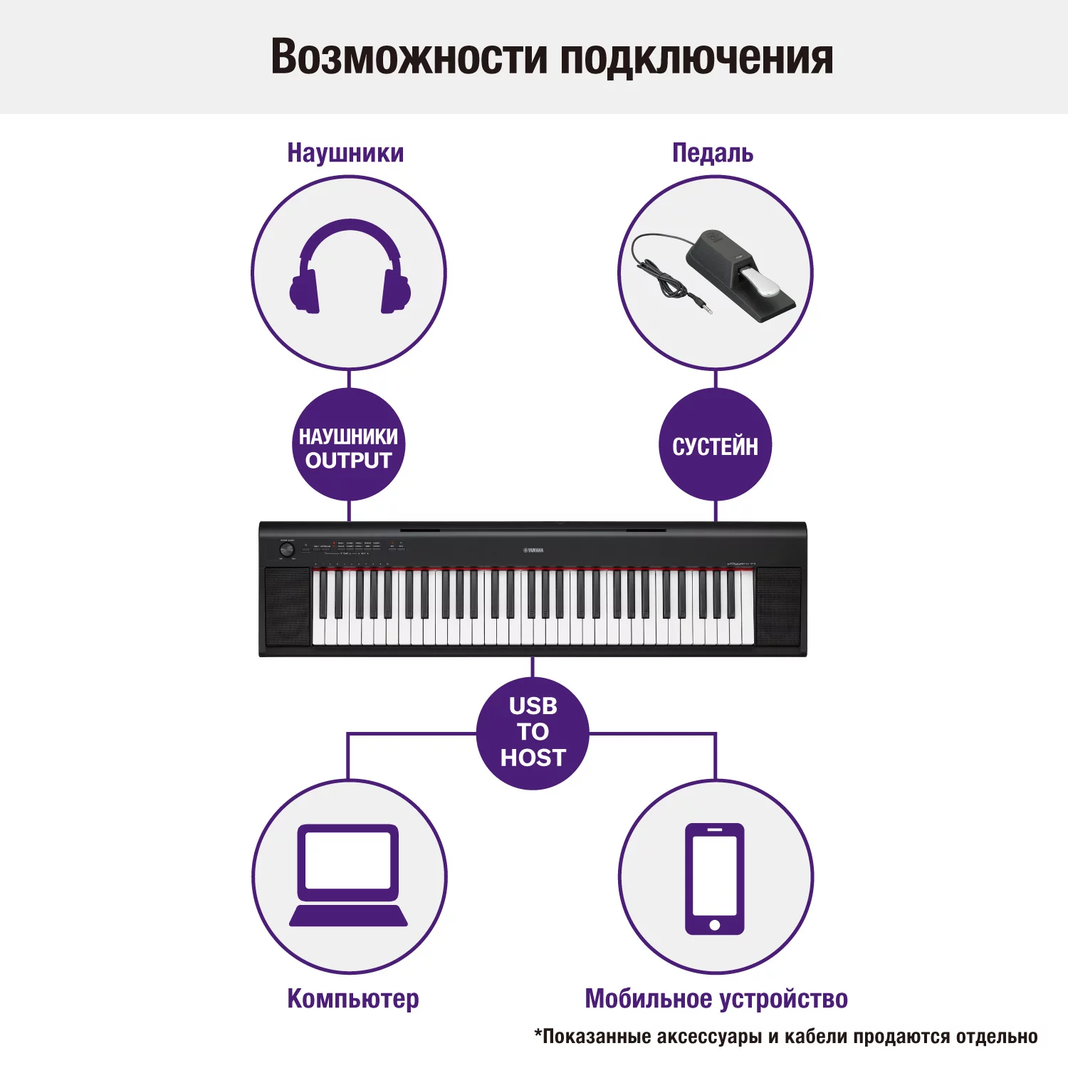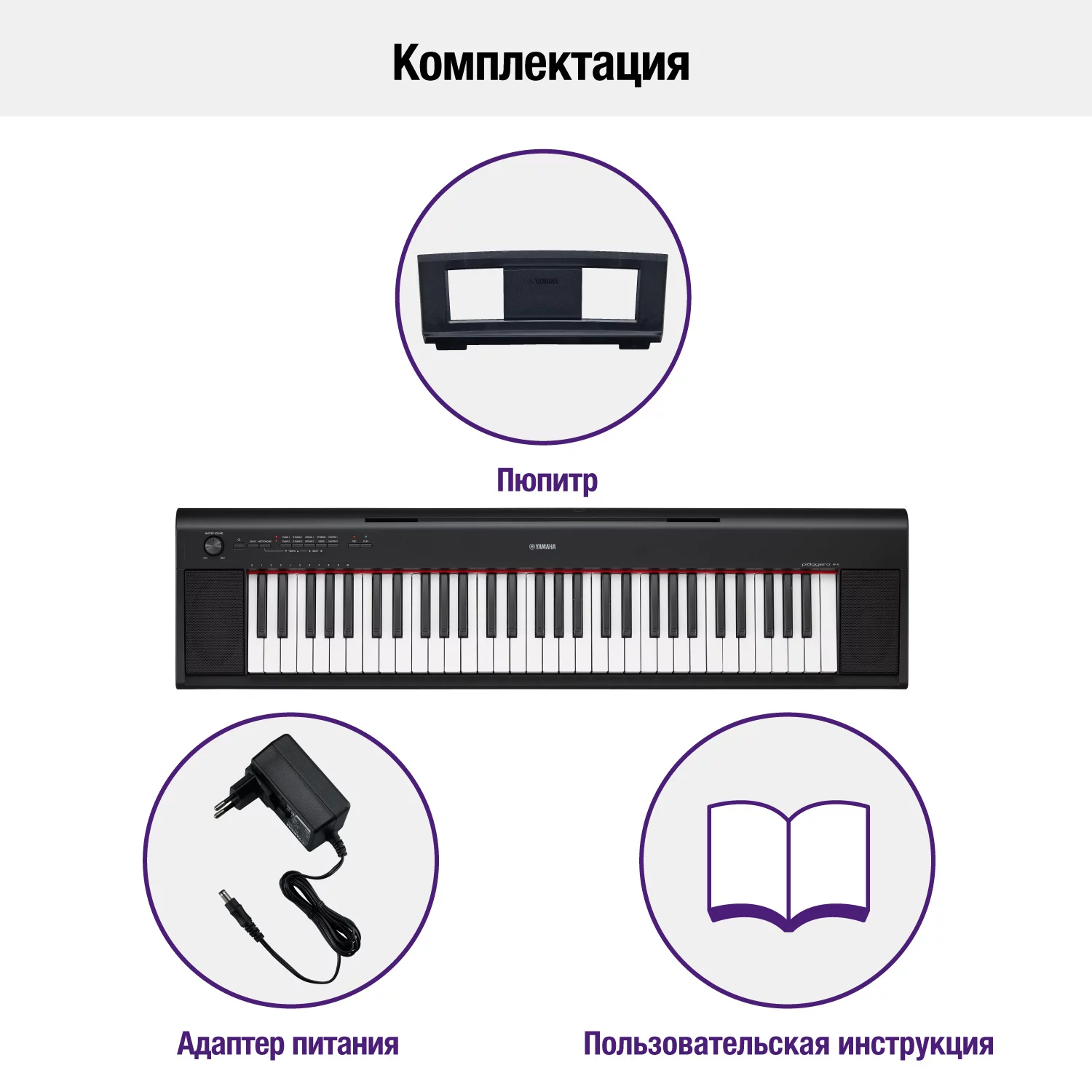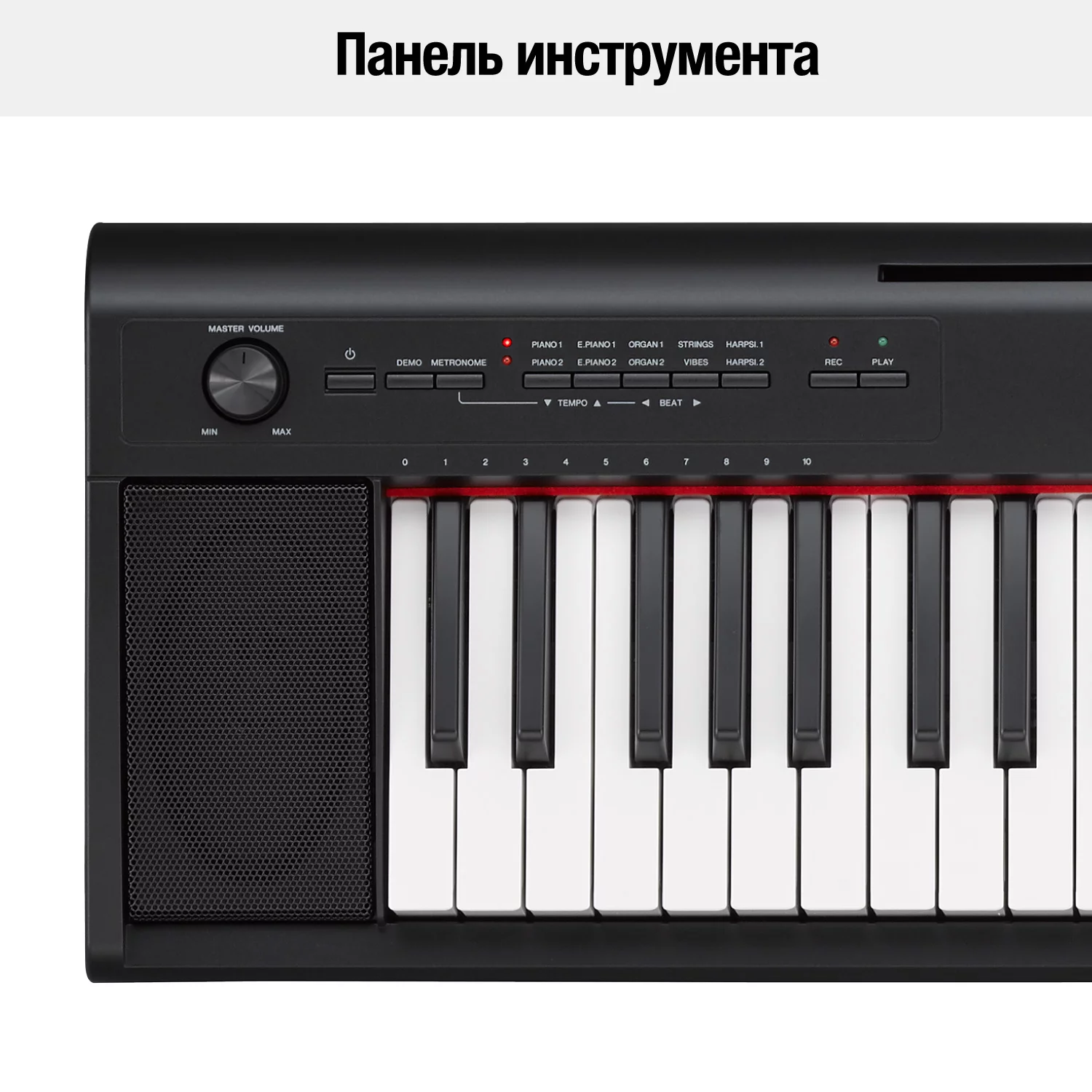 Электронное фортепиано Yamaha NP-12B имеет динамическую и неградуированную клавиатуру на 61 полноразмерную клавишу. Поэтому тактильные восприятия будут несколько разниться от привычной манеры игры на классических клавишных инструментах.