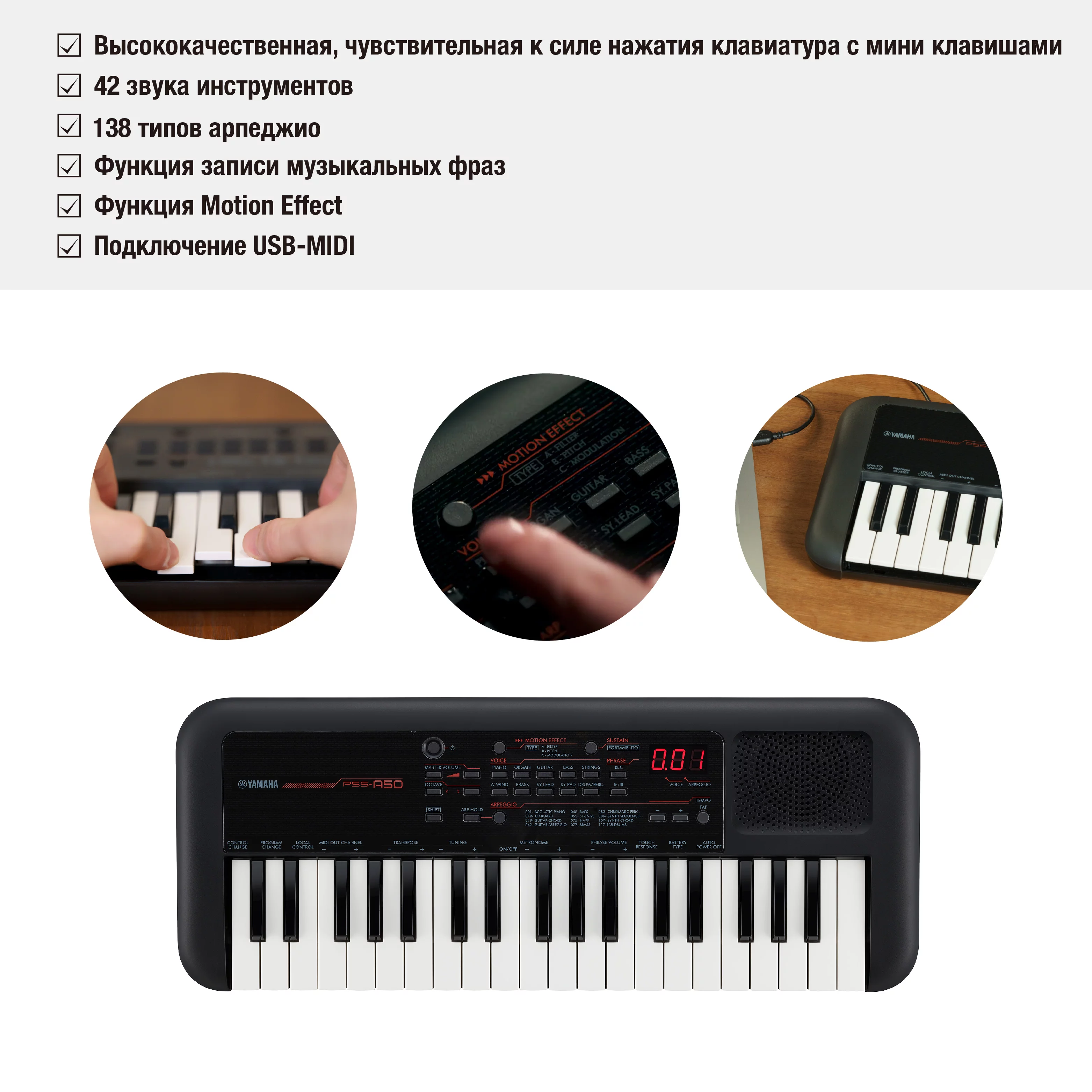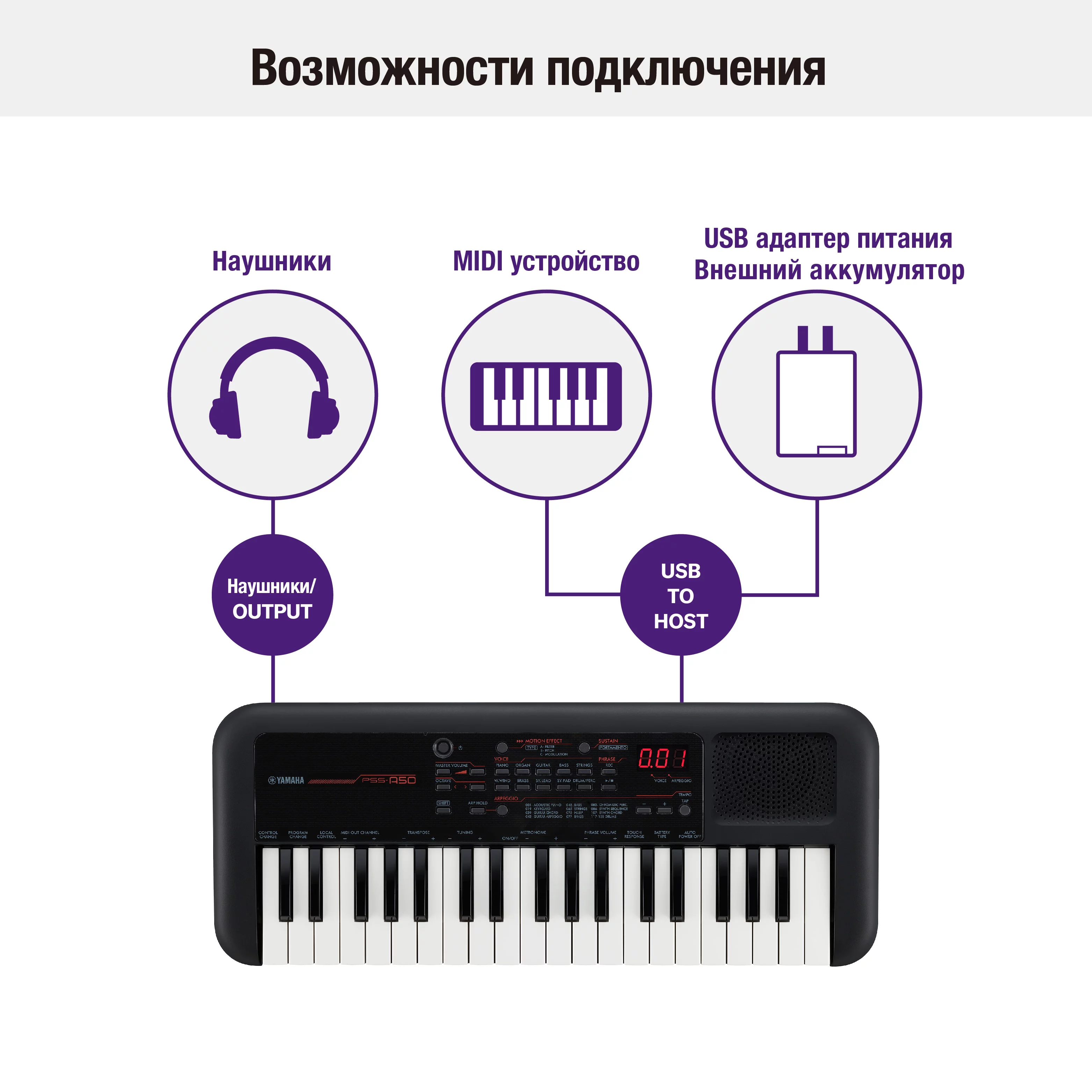 Встроенный арпеджиатор вдохновляет на новые идеи, создает мелодии и ритмы и помогает вам в творчестве, а с помощью функции Phrase Recorder можно зацикливать, воспроизводить и записывать музыкальные фразы. Подключите PSS-A50 к своей домашней системе звукозаписи и исследуйте другие возможности вашего верного спутника в музыкальном творчестве.
