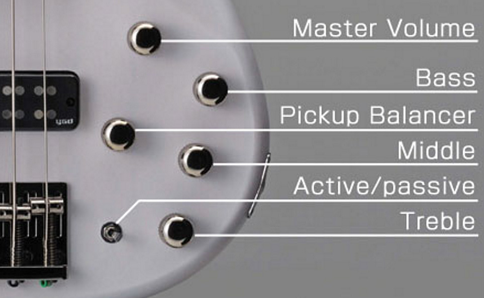 Регуляторы: Громкость, баланс звукоснимателей, НЧ, СЧ, ВЧ, переключатель активного/пассивного режимов (индикатор разрядки батареи на задней части корпуса).